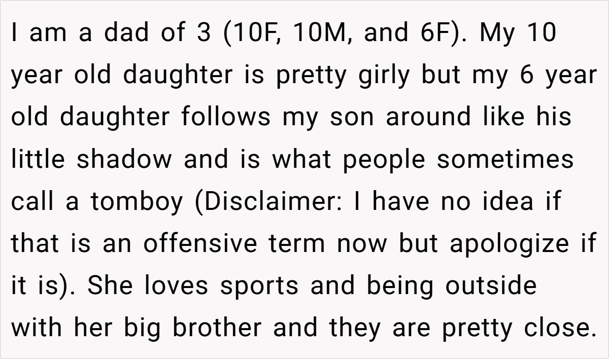 In this story, the father—a proud parent of three—witnessed firsthand how traditional gender expectations can create tension in a household. While his daughter thrives on outdoor play and sports alongside her brother, her grandmother’s outdated admonitions triggered a family debate. This event raises questions about the influence of cultural norms on children and invites a closer look at the importance of respecting individual identities while fostering a nurturing family environment.