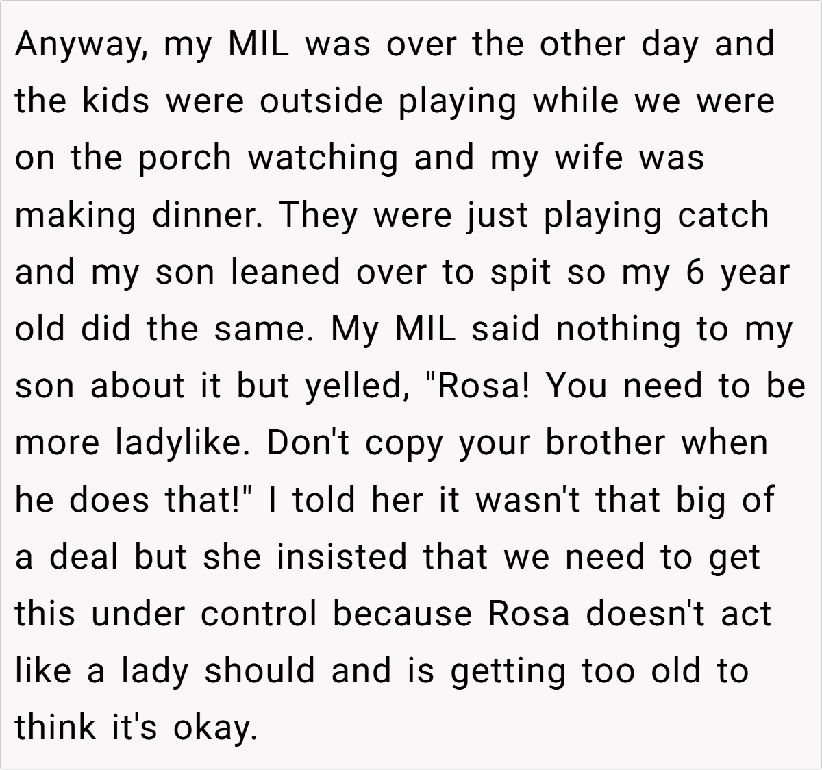 Family dynamics are a constant dance of personalities, expectations, and cultural influences. In today’s evolving world, the ways we define and enforce gender roles are increasingly being questioned. One dad recently shared his story of navigating a delicate situation when his mother-in-law scolded his 6-year-old daughter for not “being ladylike” while playing outside with her siblings. This incident, revolving around a seemingly harmless act of spitting during play, highlights a clash between old-fashioned beliefs and modern parenting values.
