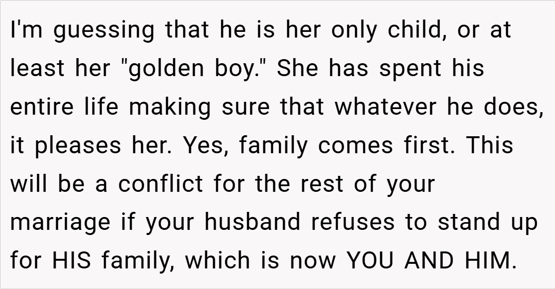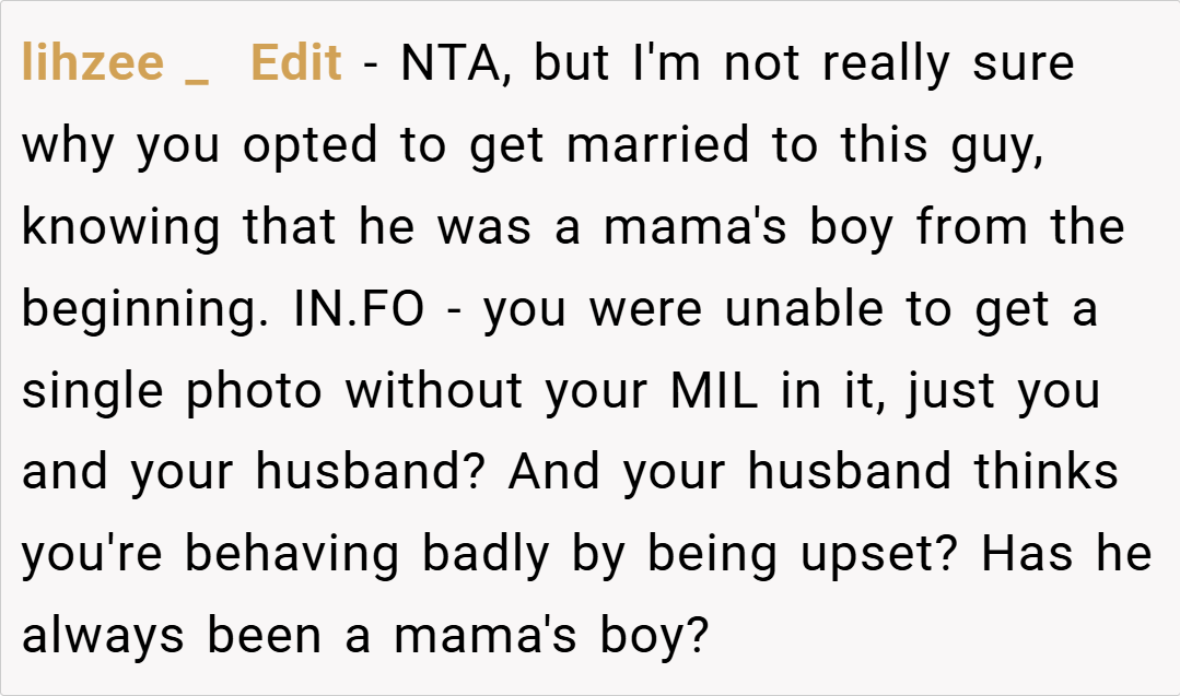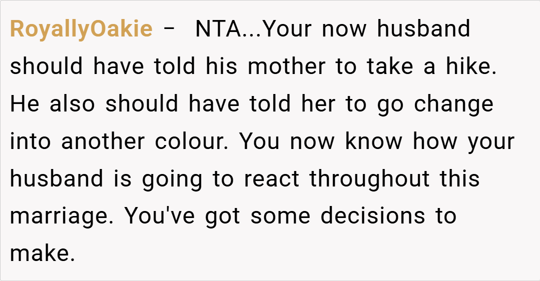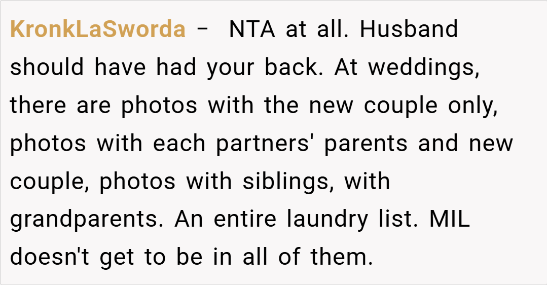 Many also noted that your husband should have supported your boundaries by asking his mother to leave the frame. While some voices raised concerns about potential long-term implications if he doesn’t stand up for you, the consensus is that you’re entirely justified in insisting on a moment that belongs solely to you as a couple.