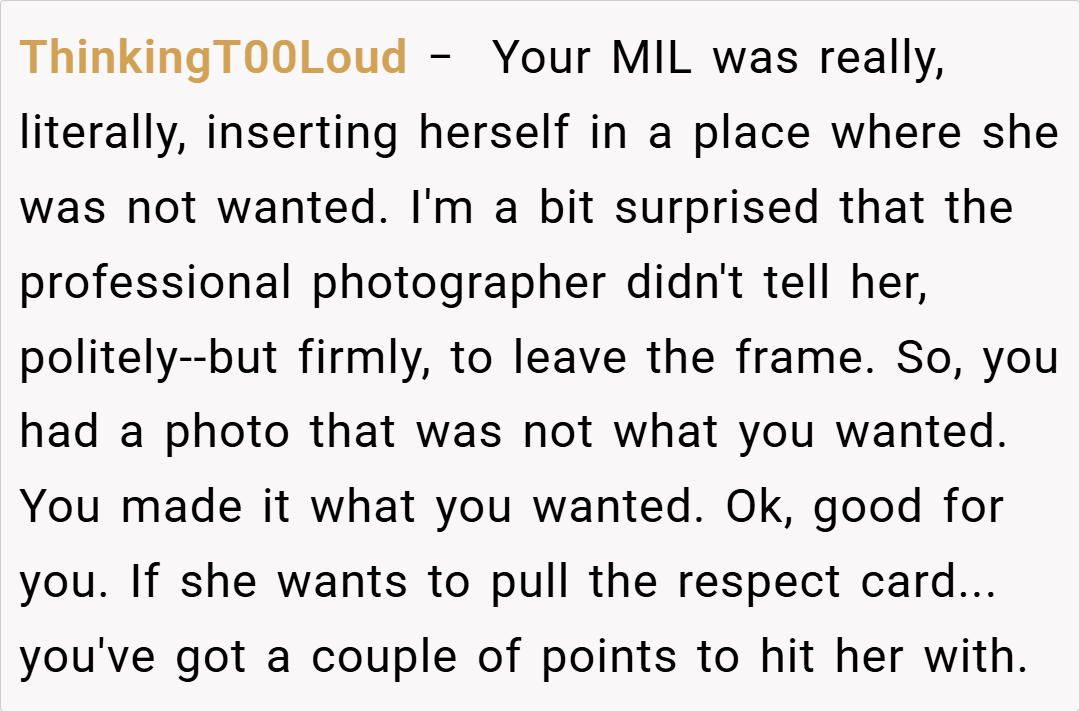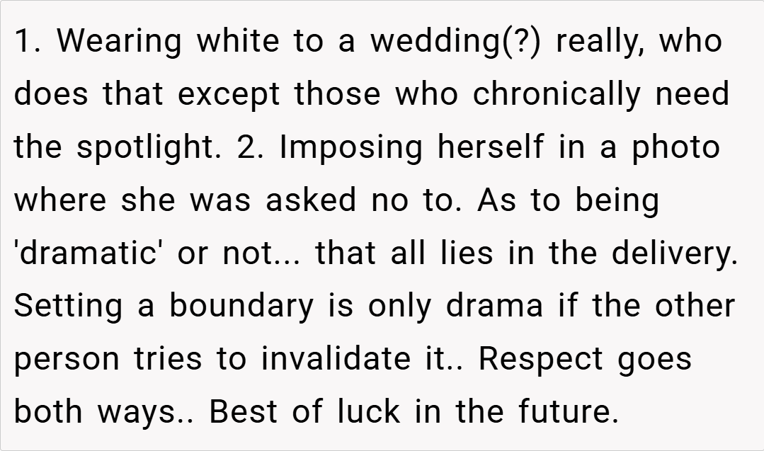 In the end, your wedding day was your day, and you had every right to insist on a photo that captured just you and your husband. How do you think couples should handle situations when a family member repeatedly oversteps boundaries on a significant day?