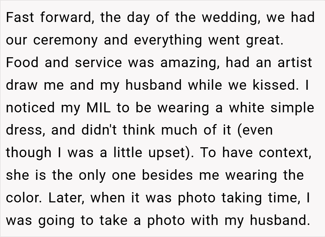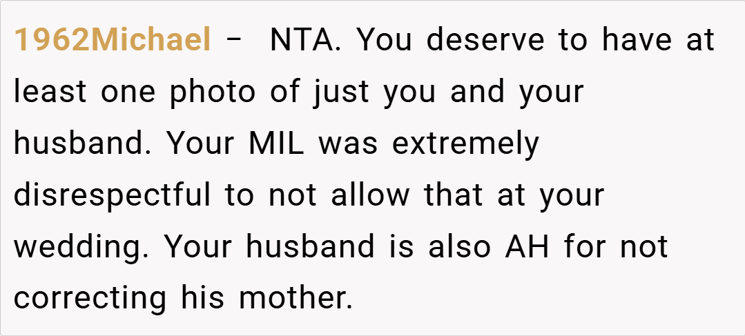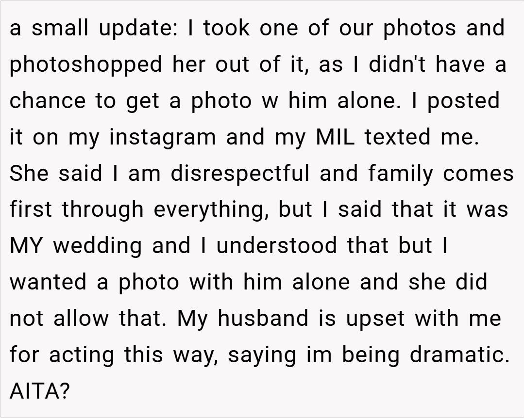 it wasn’t a rejection of family altogether—it was about preserving a moment that belonged exclusively to you as a couple. Given her ongoing attempts to insert herself into your wedding decisions, your request to have a photo with just you and your husband is completely understandable.