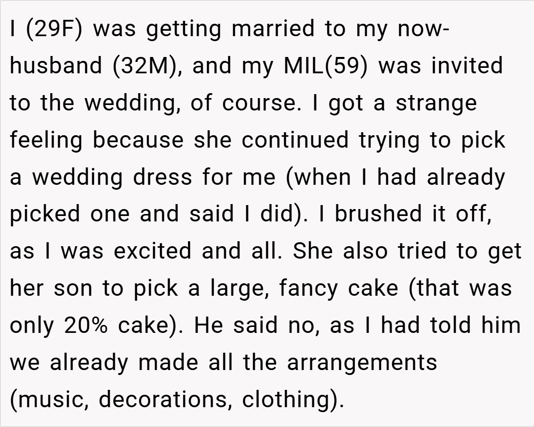 The Reddit community overwhelmingly supports your stance, with many commenters pointing out that your MIL’s behavior was intrusive and disrespectful. Most agree that your wedding should have centered on you and your husband.