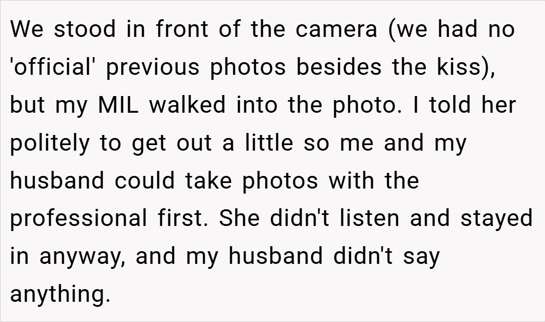 Your wedding day was one of the most important moments of your life, and you deserved to capture memories that truly reflected the celebration of your love with your husband. When you asked your MIL to step out of a photo you were taking with your husband,