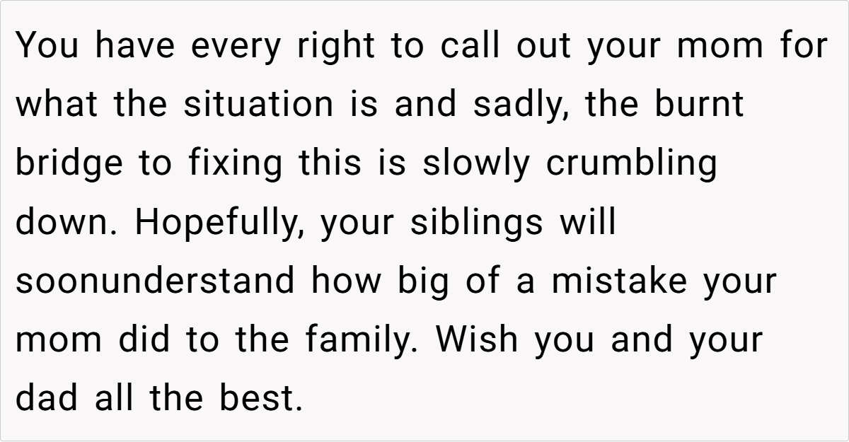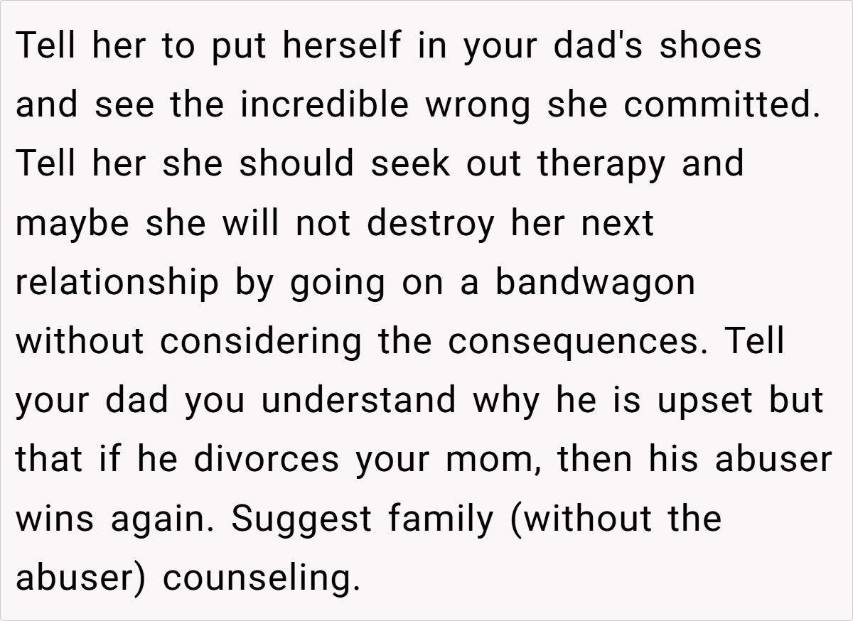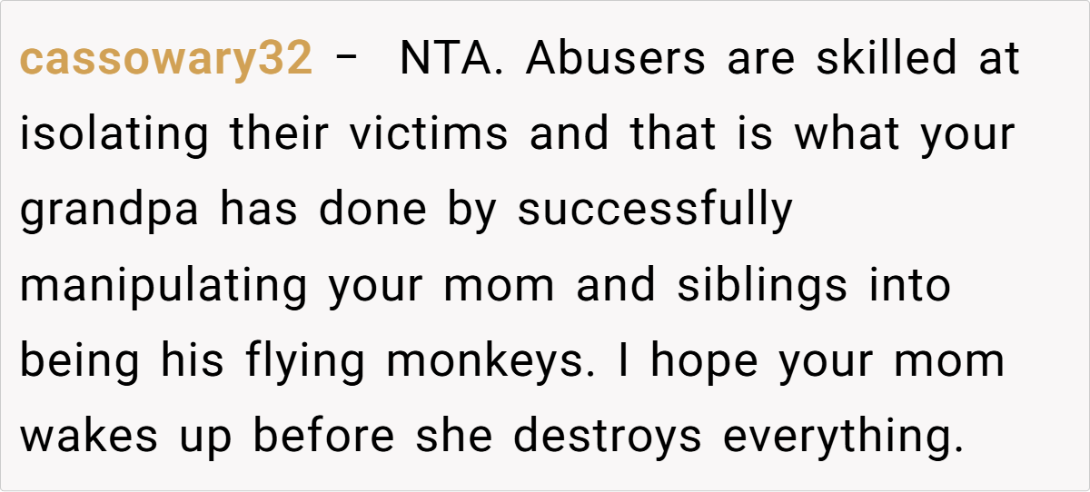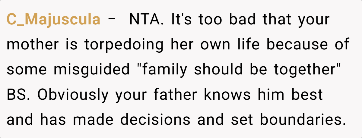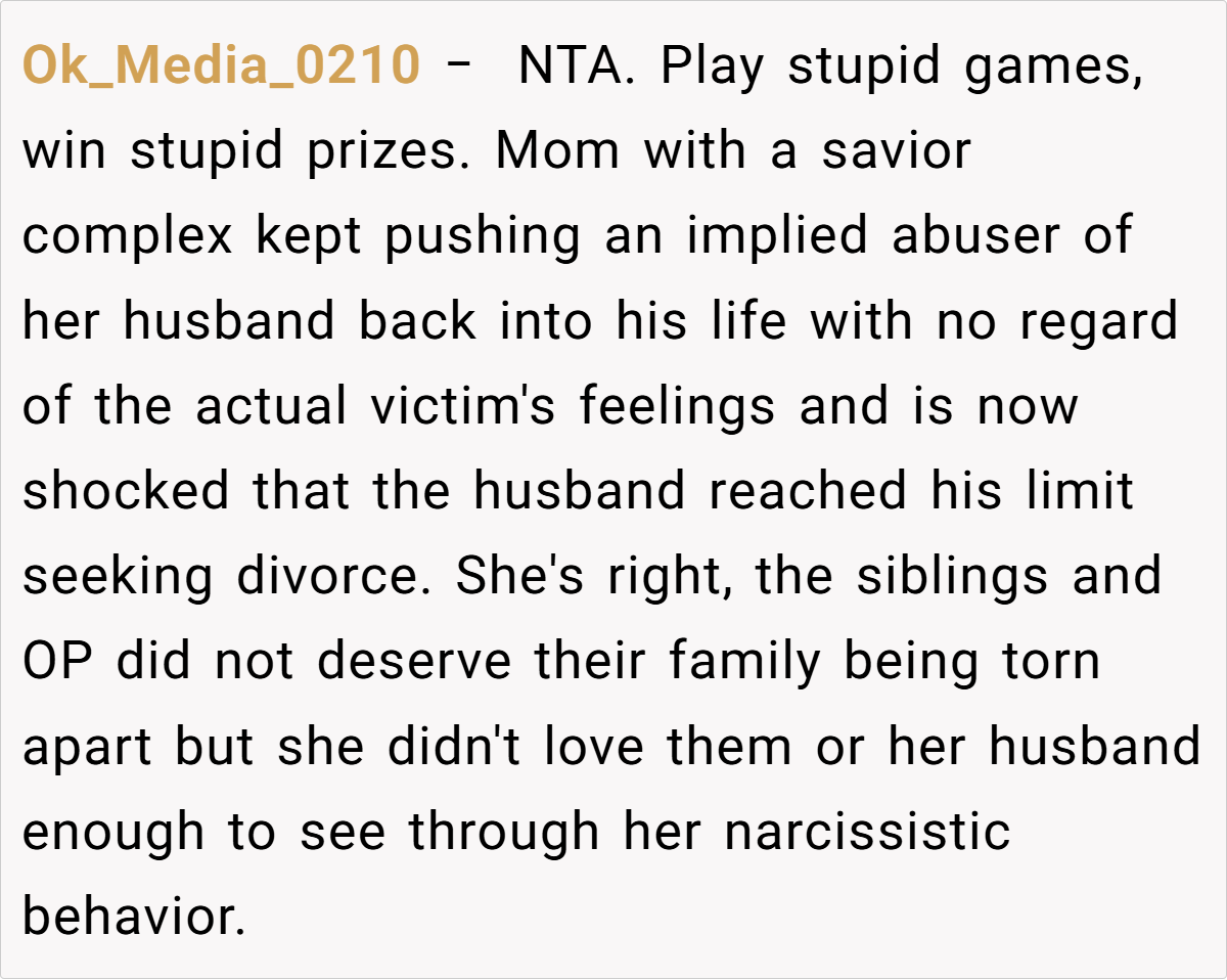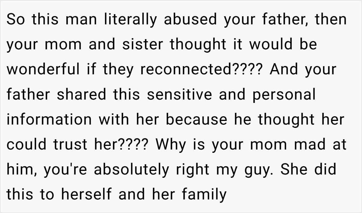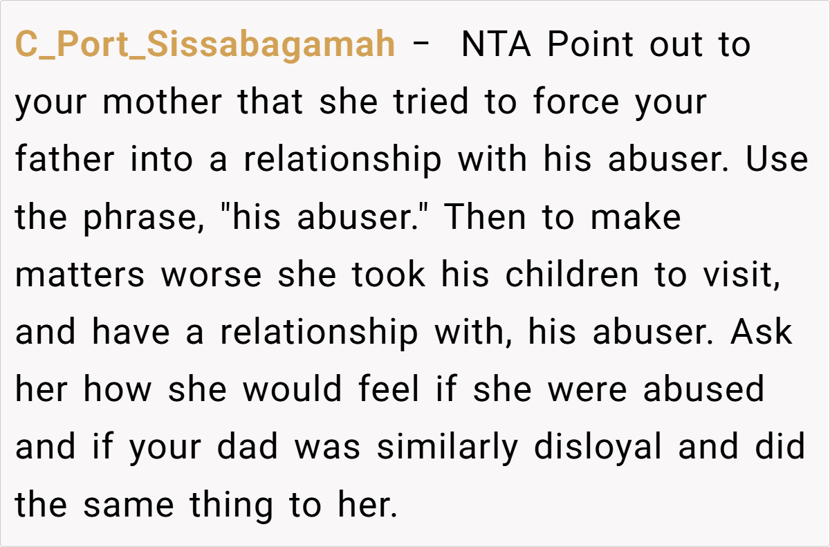 A glance at Reddit reveals a strong consensus: the OP isn’t at fault here. Many community members criticize the mother’s eagerness to reintroduce a deeply problematic figure into the family dynamic, arguing that this move has only deepened the rift.