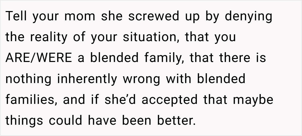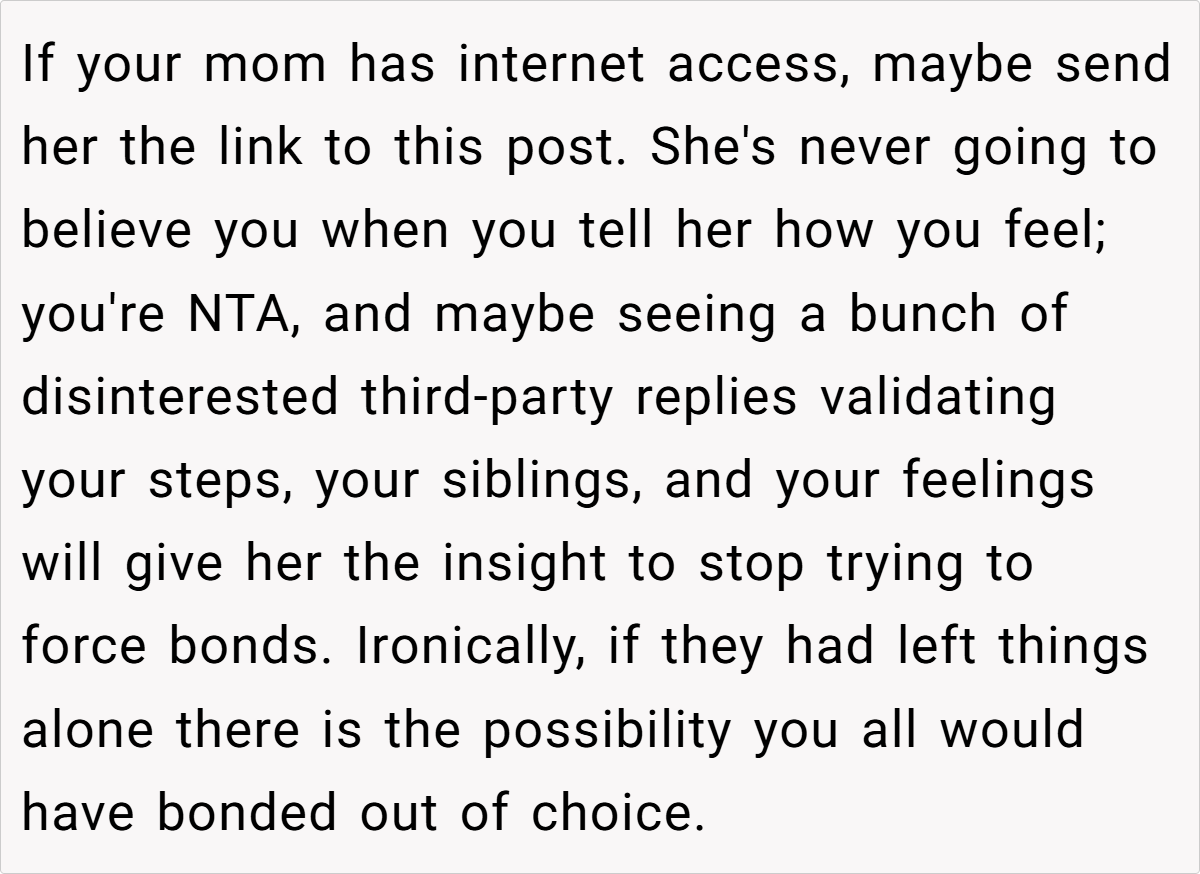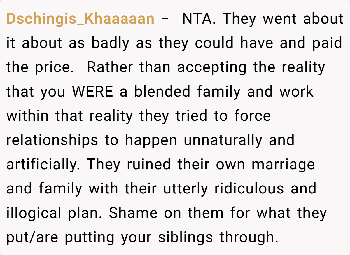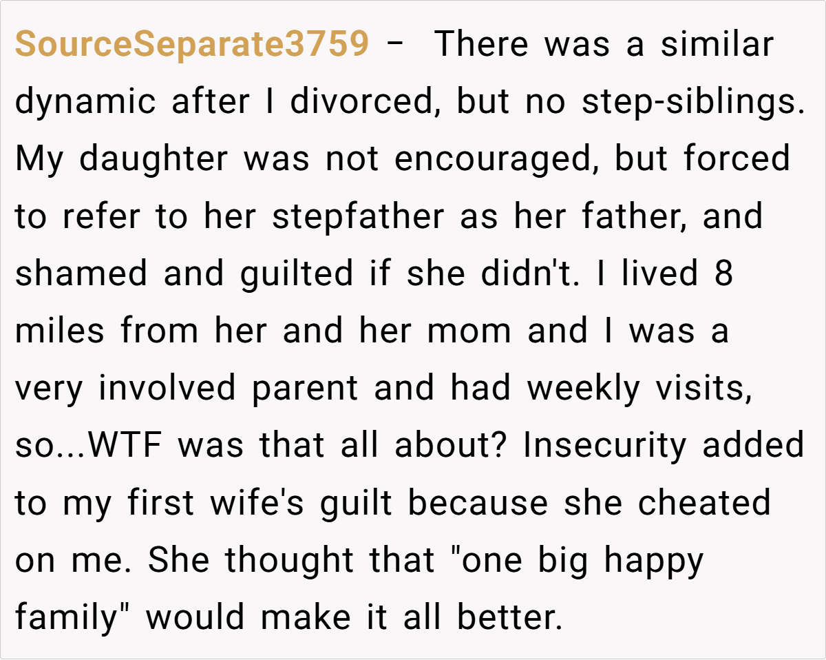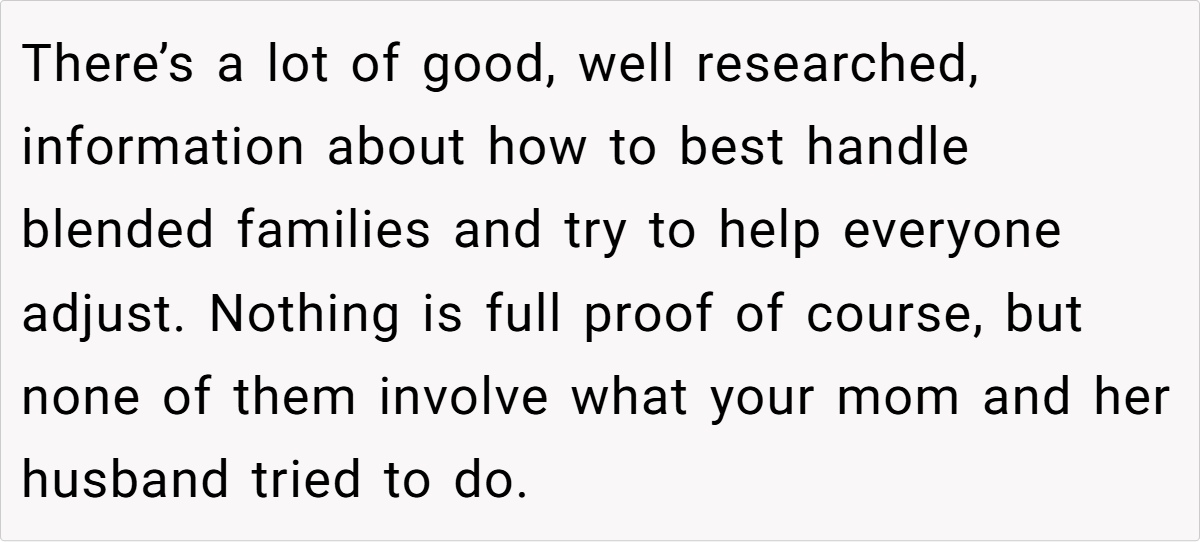 In the end, this post underscores a painful truth: genuine family bonds cannot be manufactured through coercion and set rules. The OP’s blunt call for his mom and her husband to admit their mistakes reflects the deep-seated impact of forced integration.