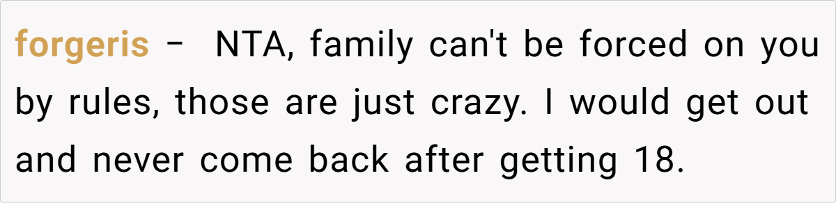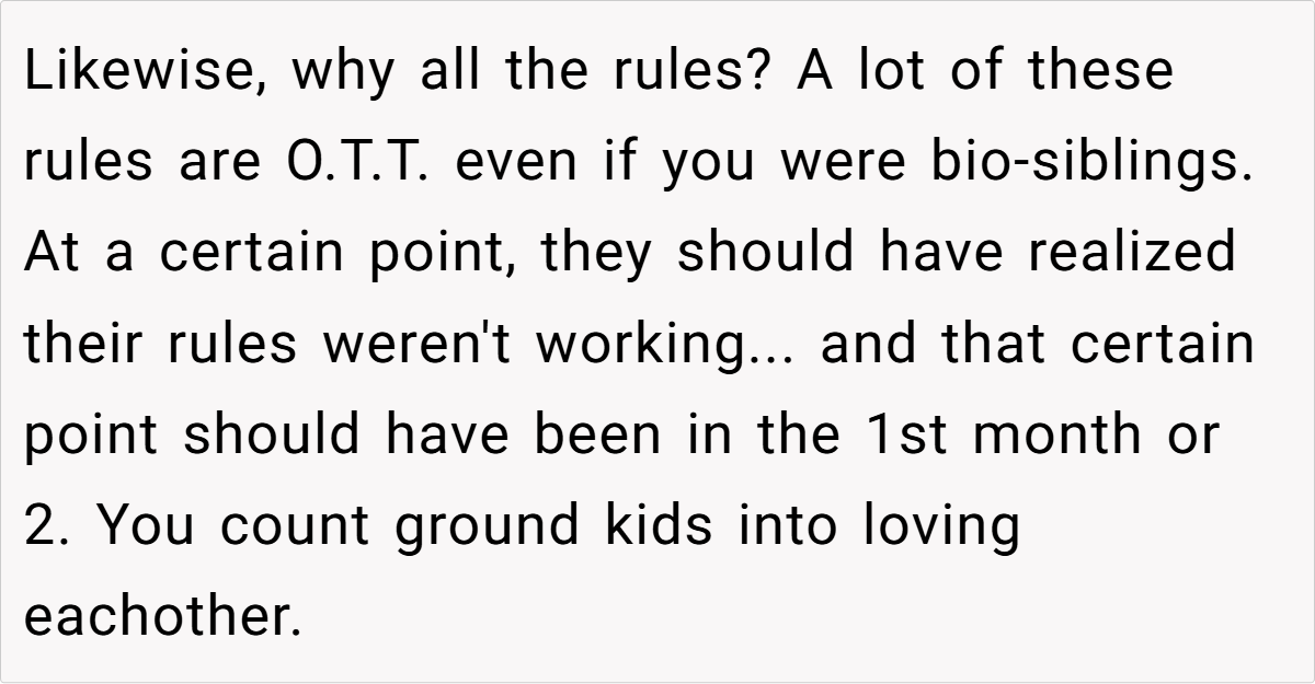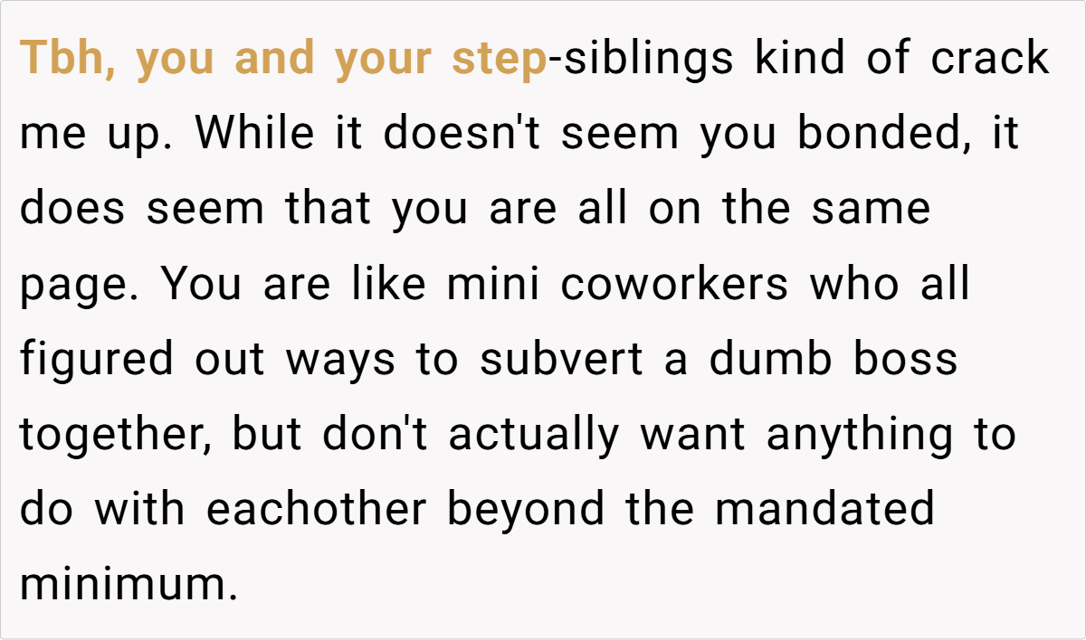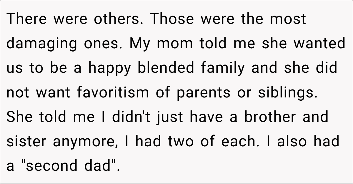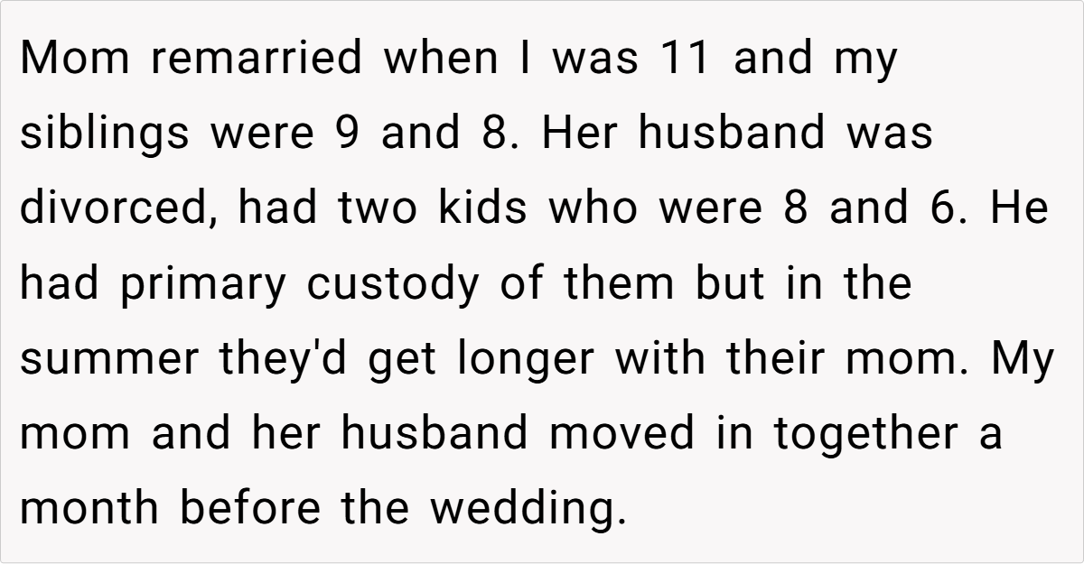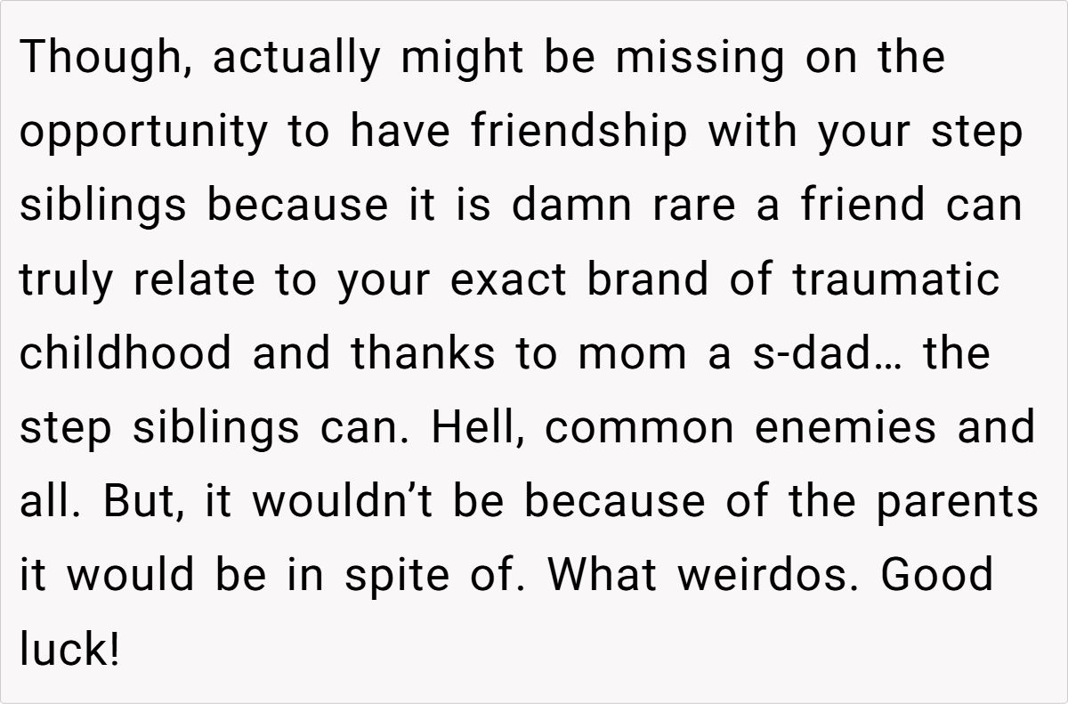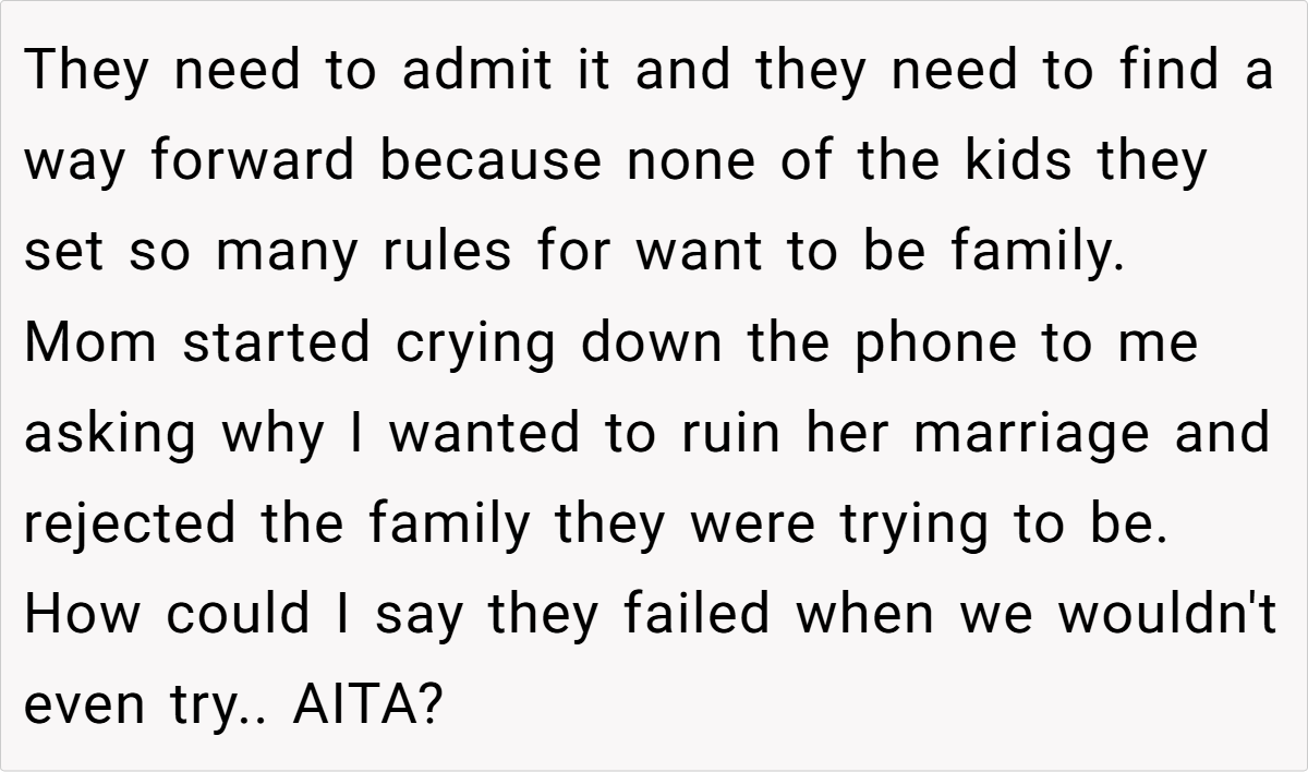 In the end, this post underscores a painful truth: genuine family bonds cannot be manufactured through coercion and set rules. The OP’s blunt call for his mom and her husband to admit their mistakes reflects the deep-seated impact of forced integration.