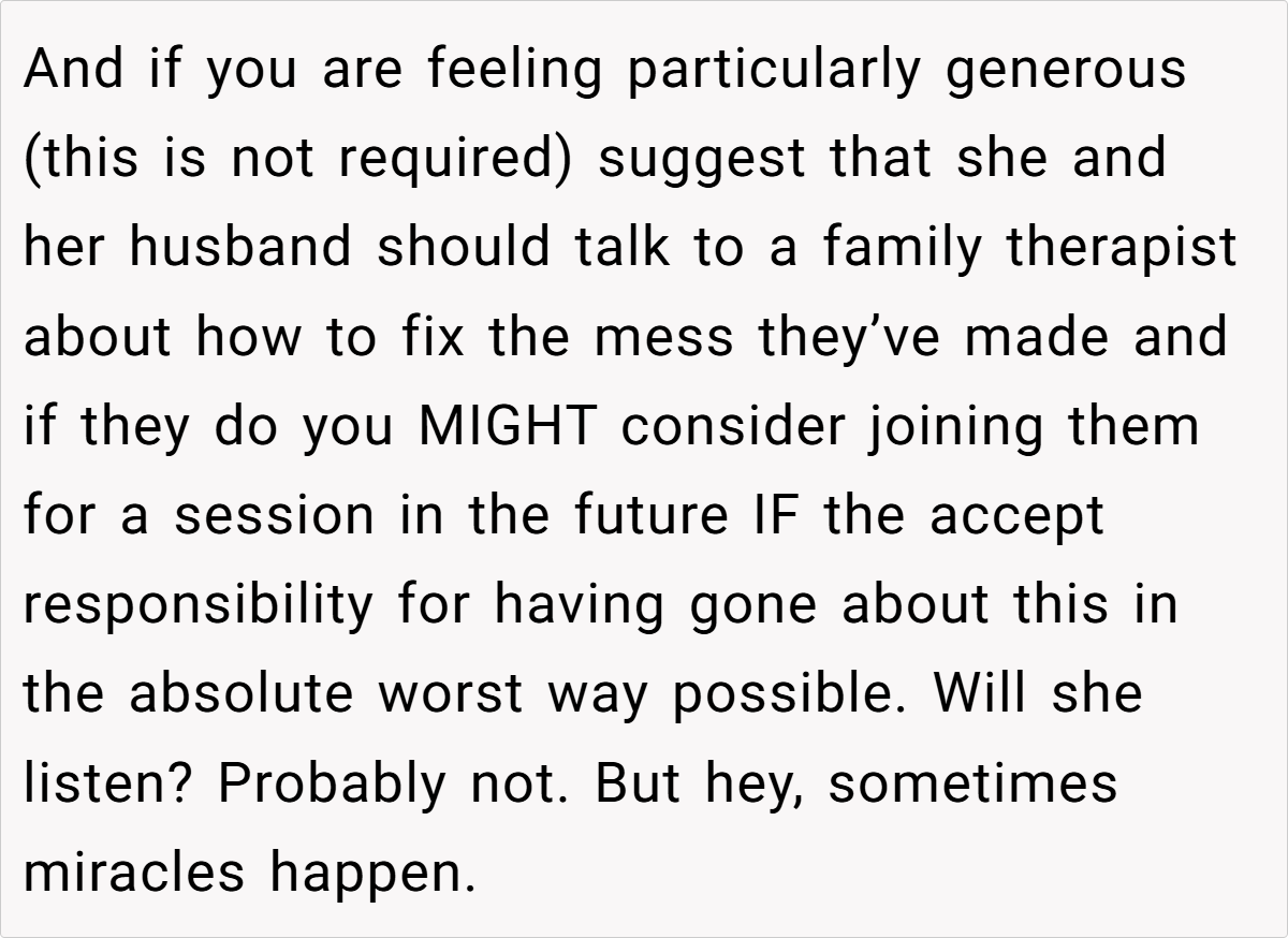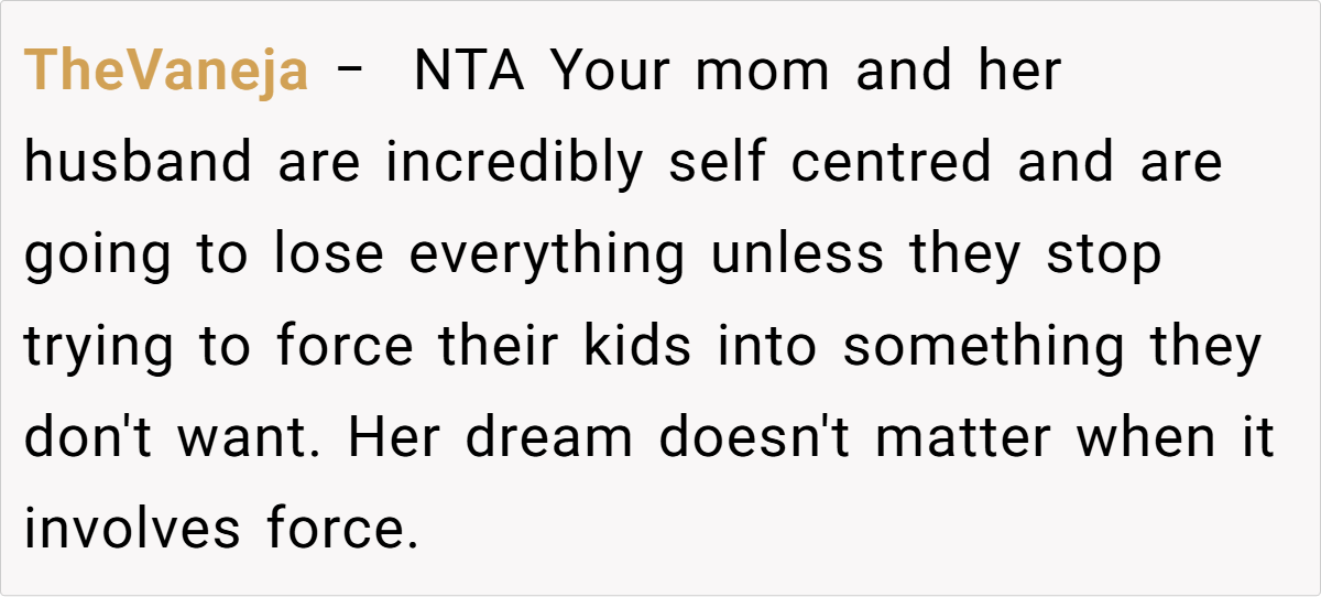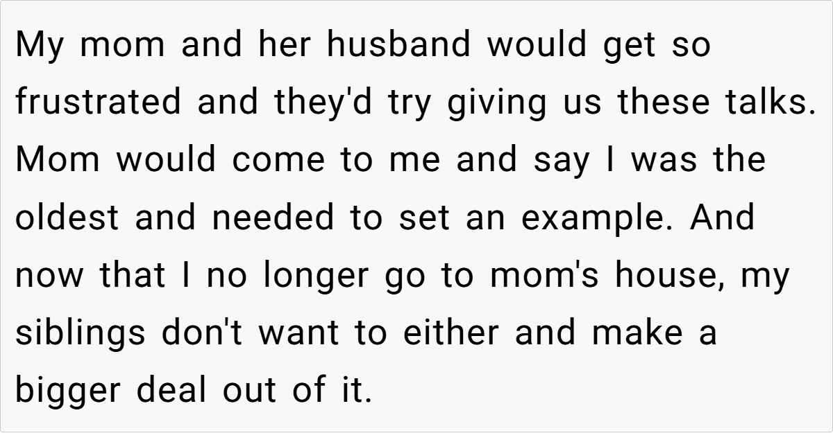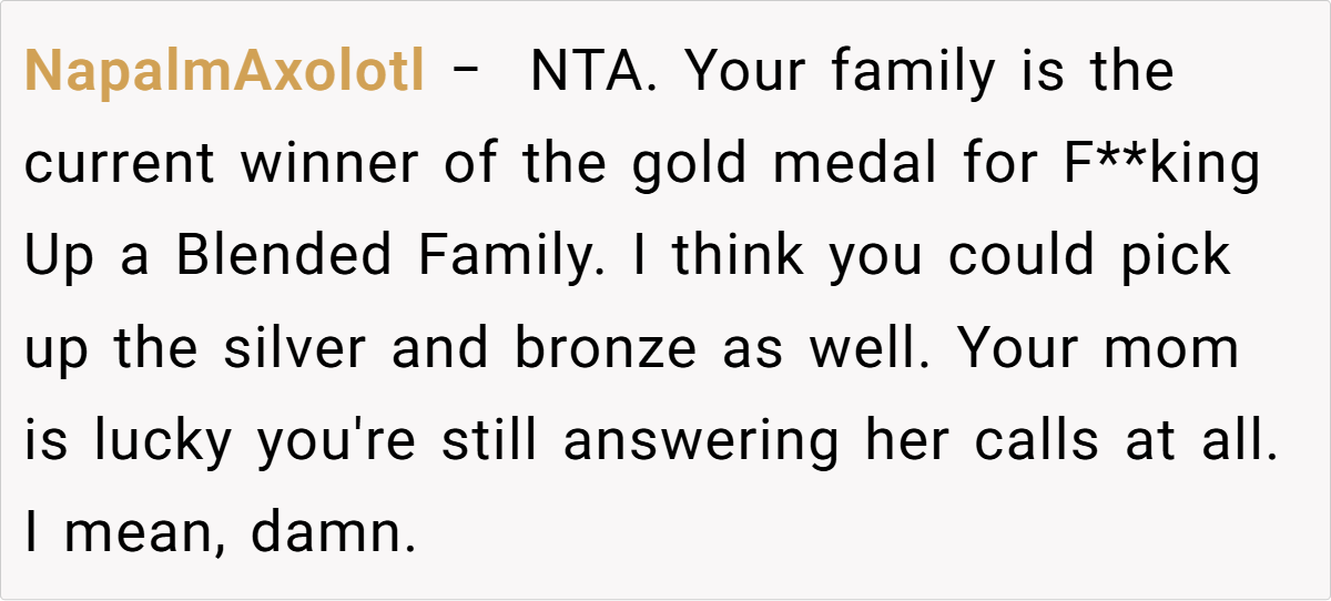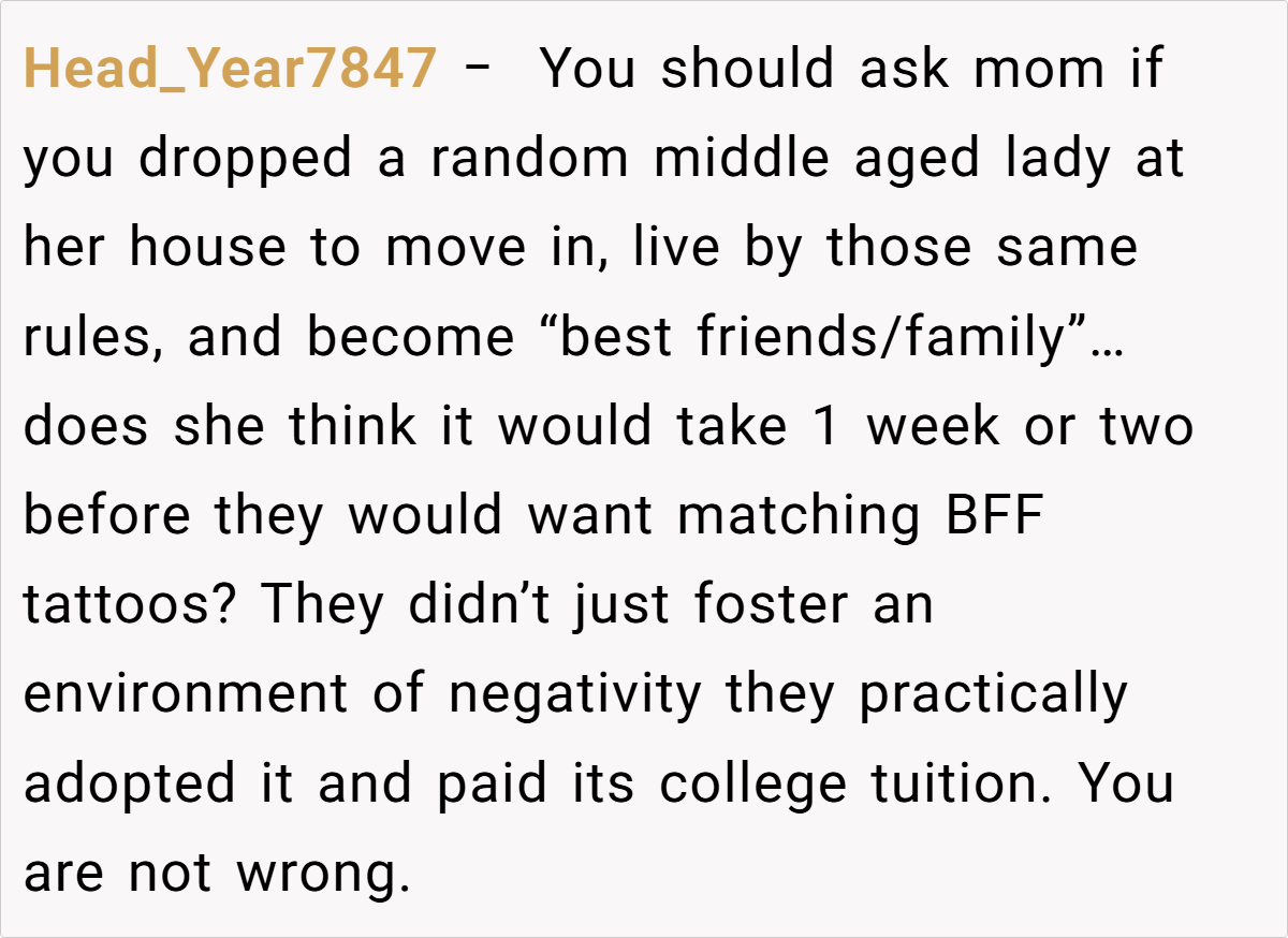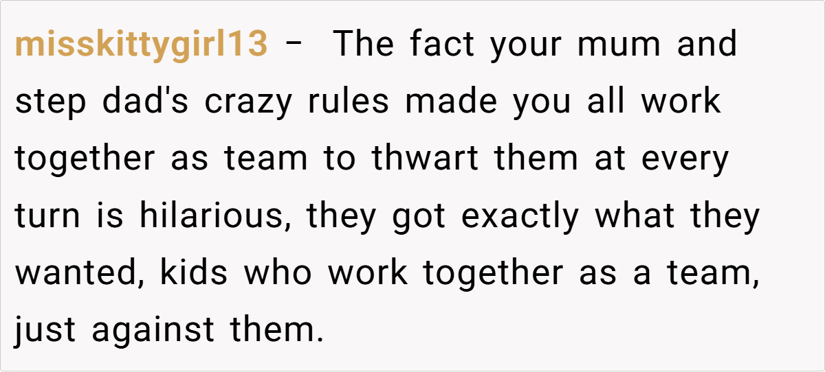 In the end, this post underscores a painful truth: genuine family bonds cannot be manufactured through coercion and set rules. The OP’s blunt call for his mom and her husband to admit their mistakes reflects the deep-seated impact of forced integration.