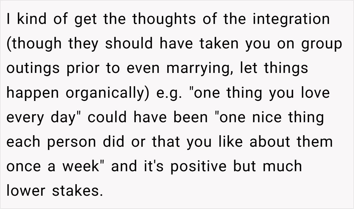 The Reddit community’s responses are overwhelmingly supportive of the OP’s stance. Commenters point out that forcing kids to adhere to arbitrary rules does nothing to build genuine connections and only intensifies feelings of alienation. Many remarked that having rules like “every day tell someone one thing you love about them” is over-the-top and inauthentic.