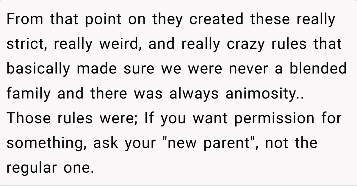 Growing up in a blended family isn’t always as smooth as some might hope. In this AITA post, an 18‑year‑old recounts how his mom and her new husband enforced a rigid set of rules—meant to create a “happy blended family”—that instead sowed division and resentment.