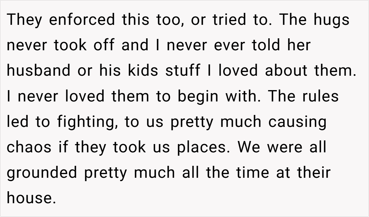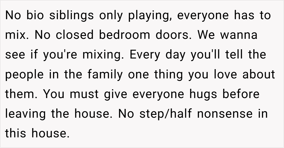 Family therapists consistently warn that trying to manufacture family unity through strict, artificial rules rarely achieves genuine bonding. In this case, the mother and her husband imposed a series of rigid rules—such as requiring daily expressions of love, forcing hugs before leaving the house, and mandating that children always ask permission only from the “new parent.”