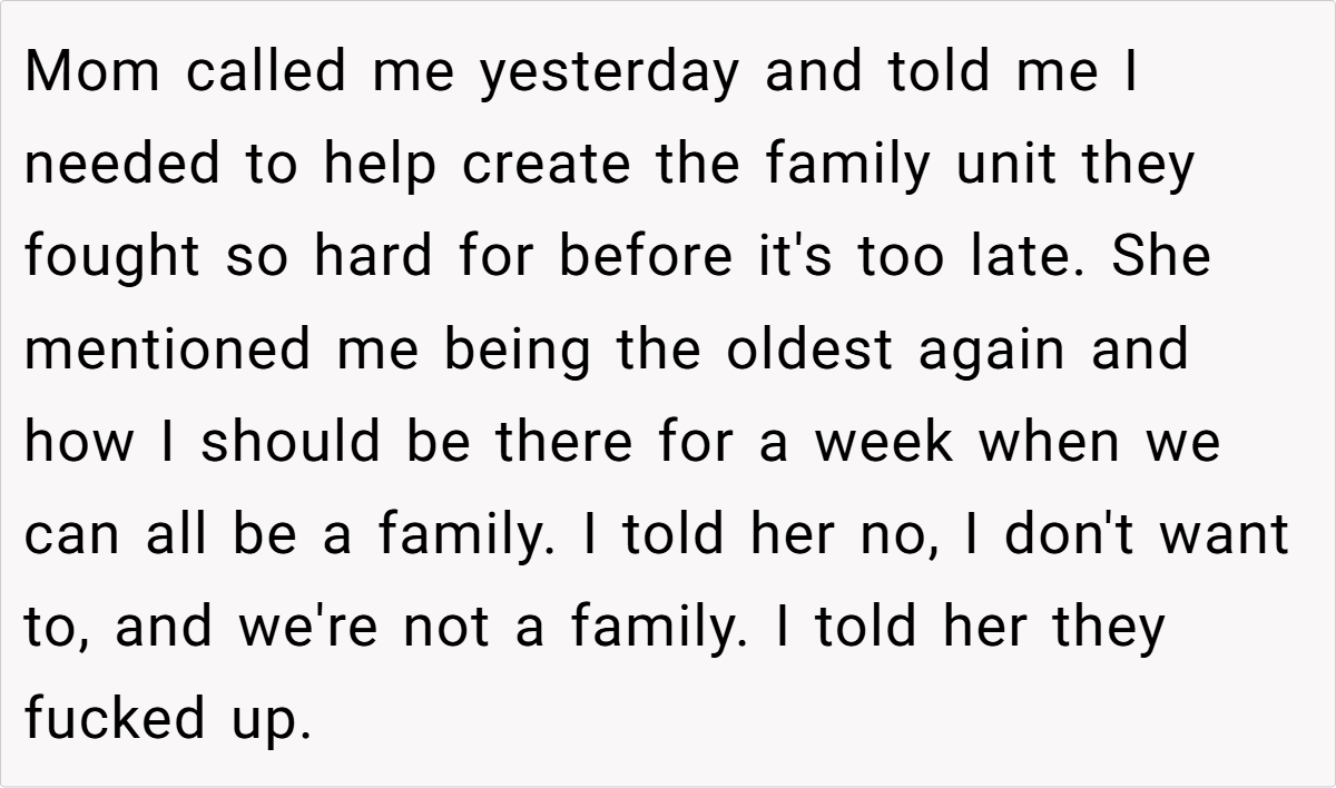Now, as an adult, he refuses to play along with their forced family unit, arguing that they need to own up to their mistakes and find a way to move on. This post taps into the pain of having relationships forced rather than allowed to develop naturally, and it questions whether such mandates can ever lead to genuine connection.