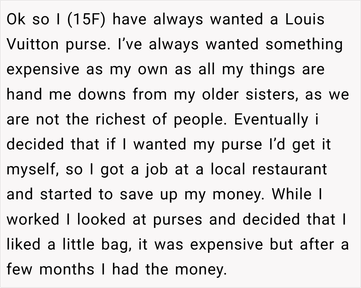 Family dynamics can often be complicated—especially when cherished possessions and personal boundaries are involved. In this case, our OP, a 15-year-old girl, recounts a heated incident with her mom over a lost Louis Vuitton purse. For years, OP has longed for an expensive bag of her own, saving up her hard-earned money to purchase one.