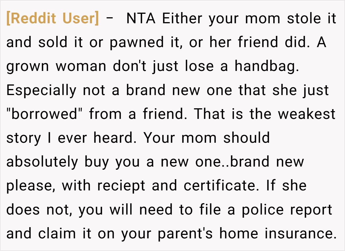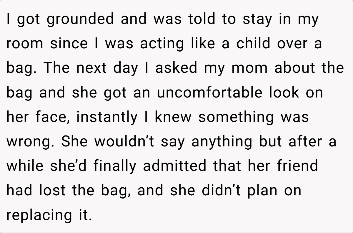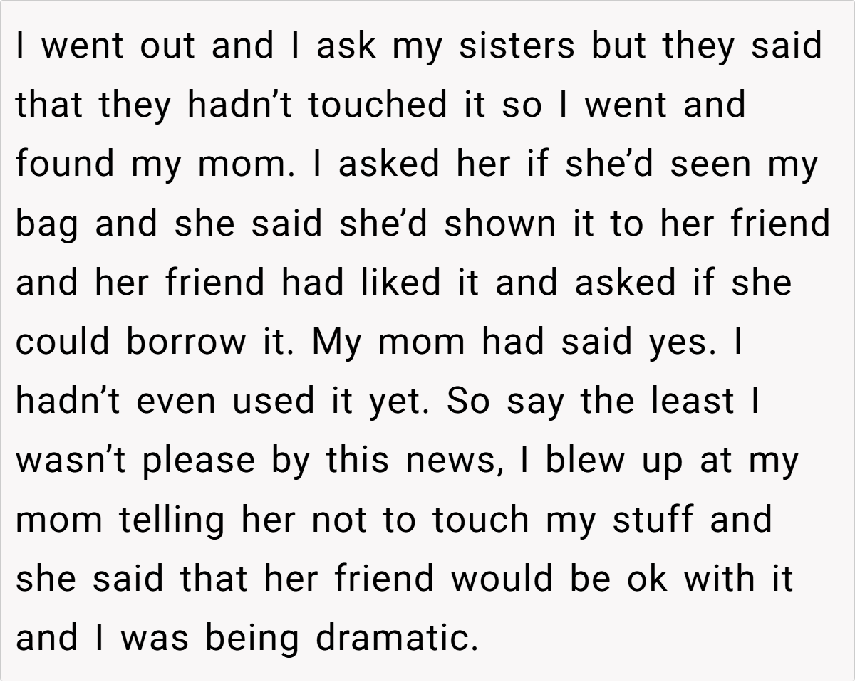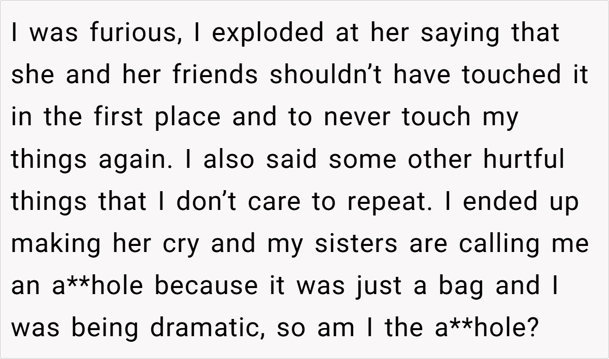 When she discovered that her mom had allowed a friend to borrow the bag—and ultimately lost it—OP’s feelings of betrayal and frustration exploded into an emotional confrontation. Now, her sisters and family say she overreacted, claiming it’s “just a bag.” But is it really just a bag, or is it about respect and trust? Let’s dive into the details and see if OP’s reaction was justified.