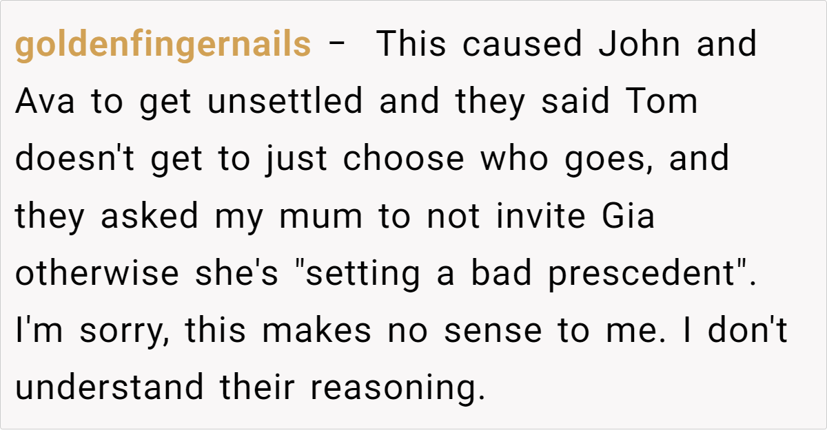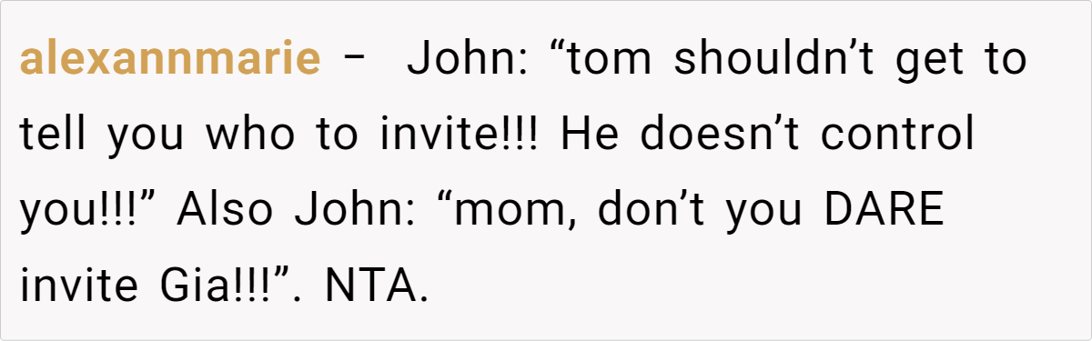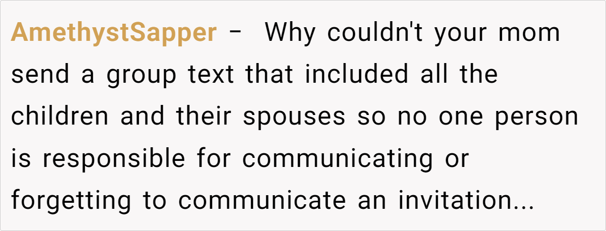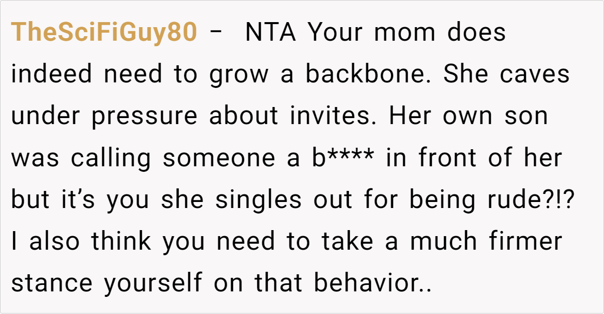 The mother’s failure to set boundaries with her son and daughter-in-law allowed them to dictate who was and wasn’t invited to a family gathering, creating a sense of exclusion and unfairness.