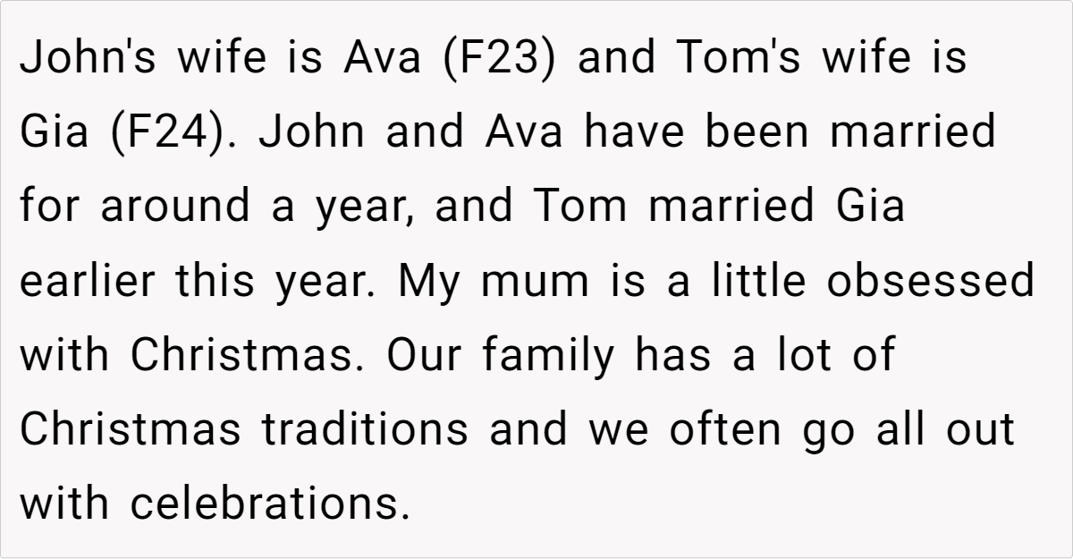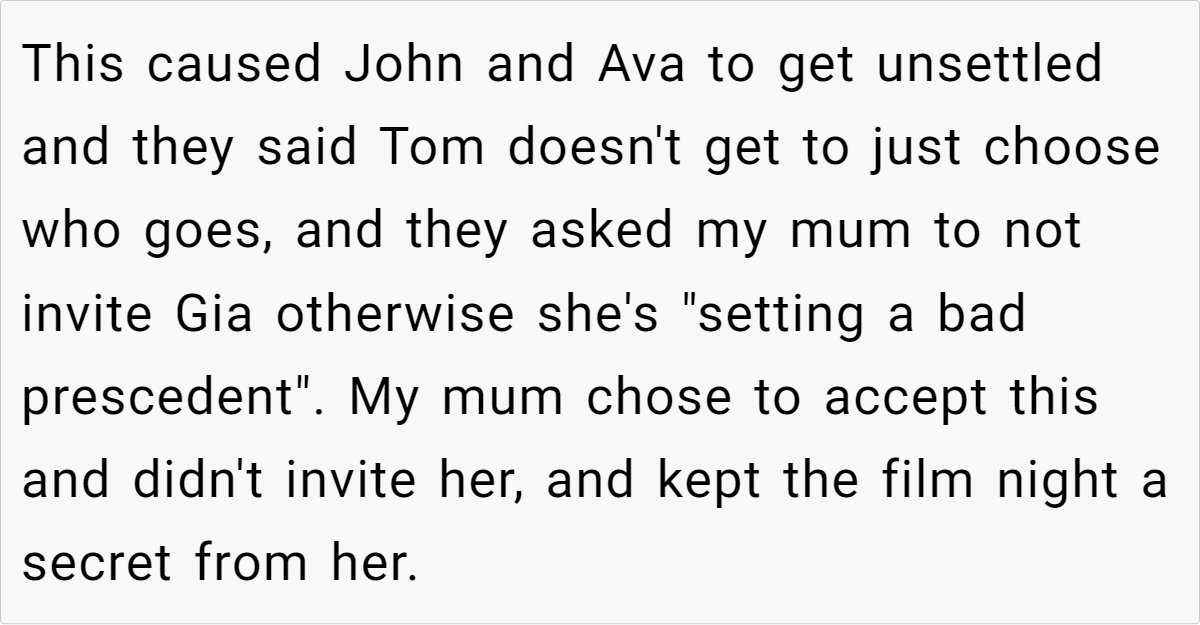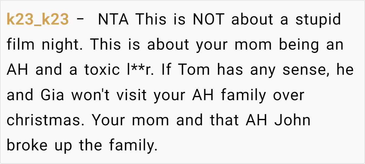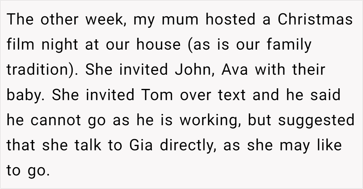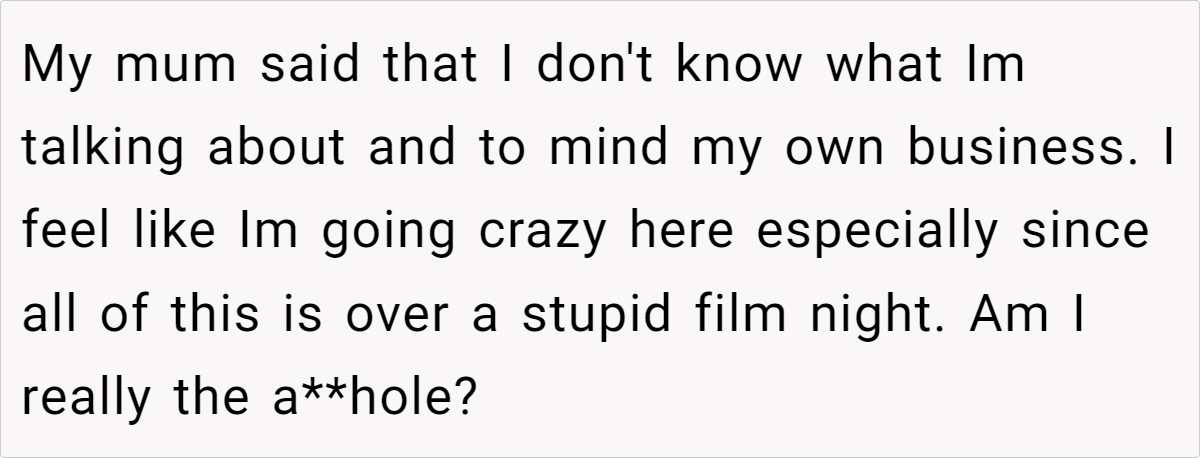 The Reddit post below details a young woman’s frustration with her mother’s passive behavior in the face of her brother and sister-in-law’s controlling actions. The situation revolves around a seemingly trivial Christmas film night, but it exposes deeper issues of family dynamics, boundaries, and the importance of assertiveness in maintaining healthy relationships.