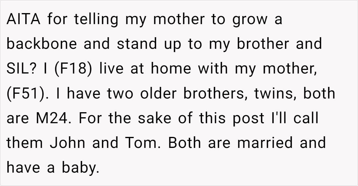 ‘ AITA for telling my mother to grow a backbone and stand up to my brother and his wife?’