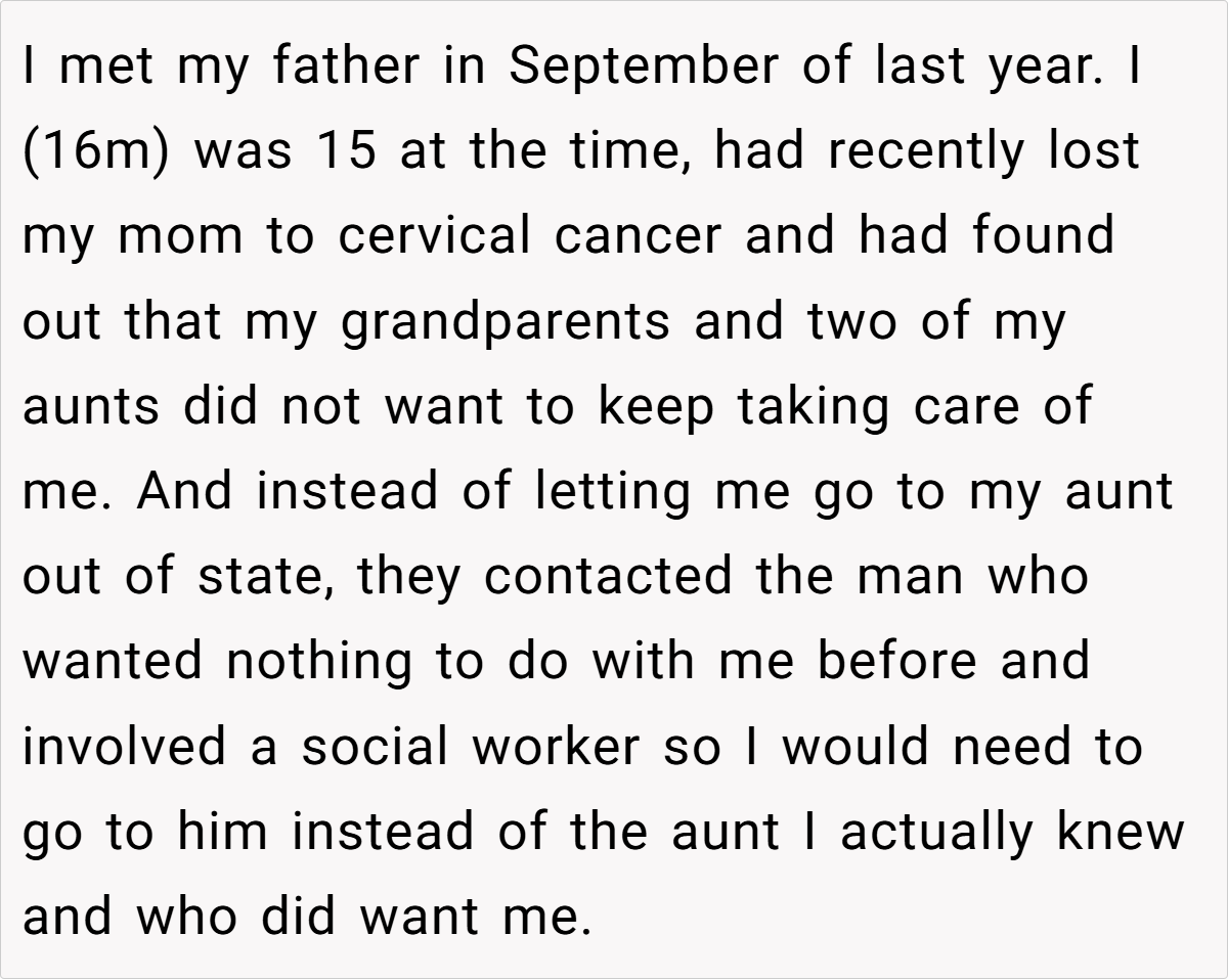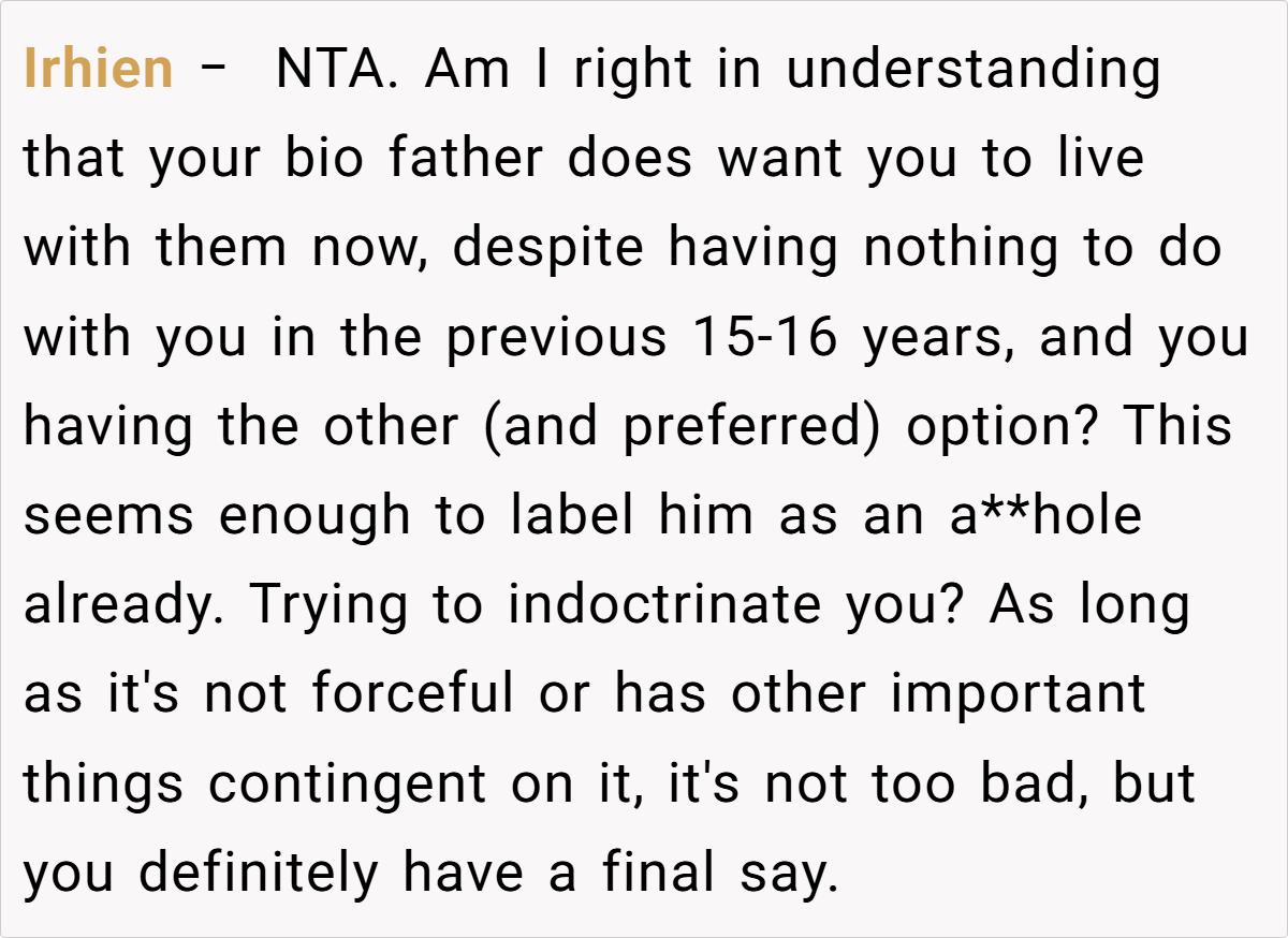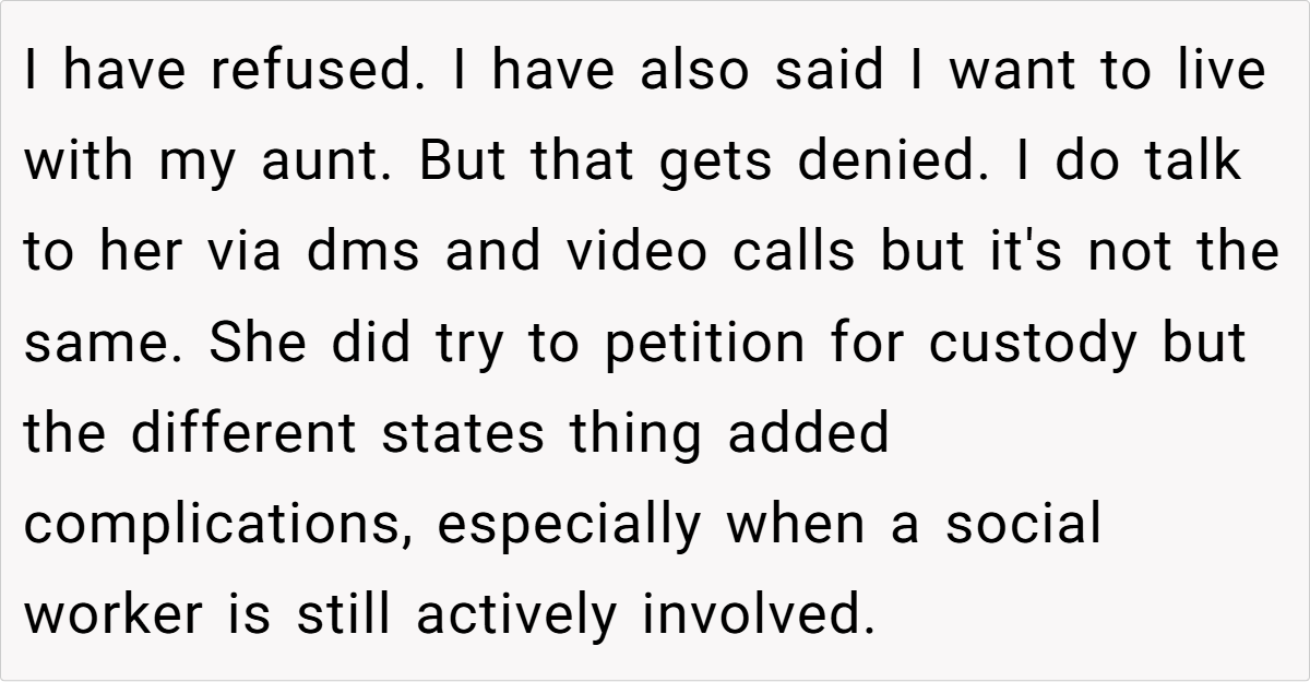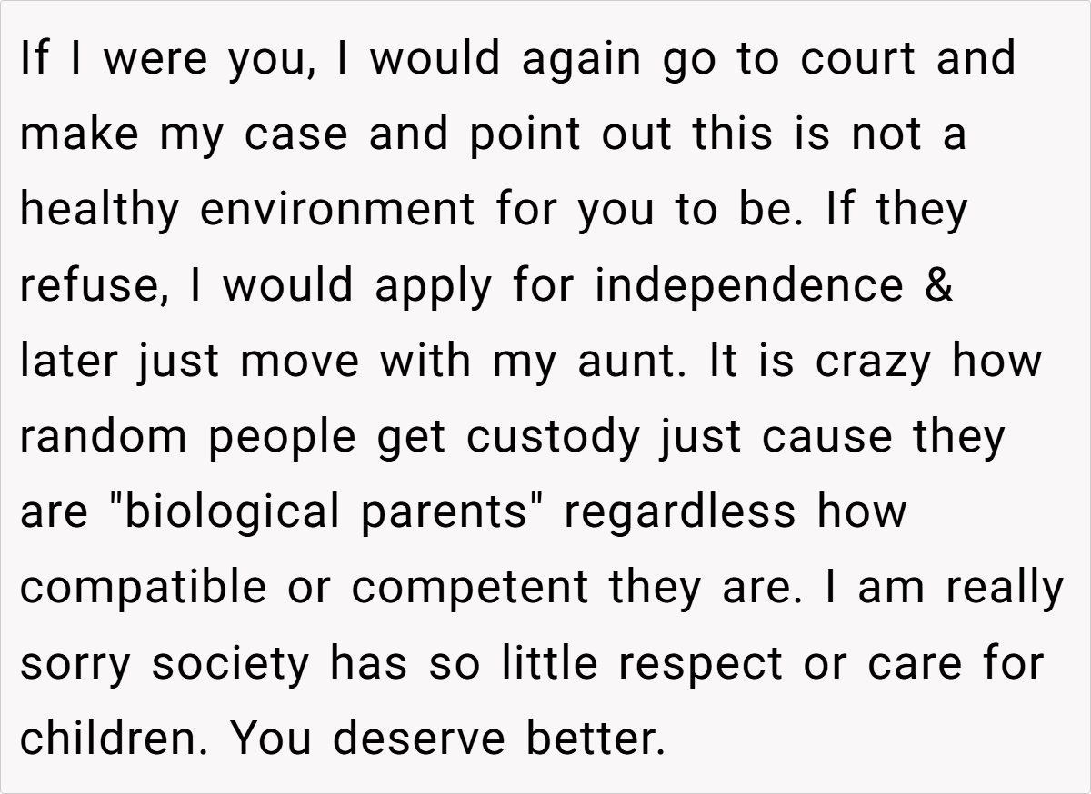 The consensus is that the system is failing him by prioritizing biological ties over genuine care. Humorous as well as heartfelt comments suggest everything from drafting a strongly-worded letter to seeking emancipation until he can legally decide for himself.