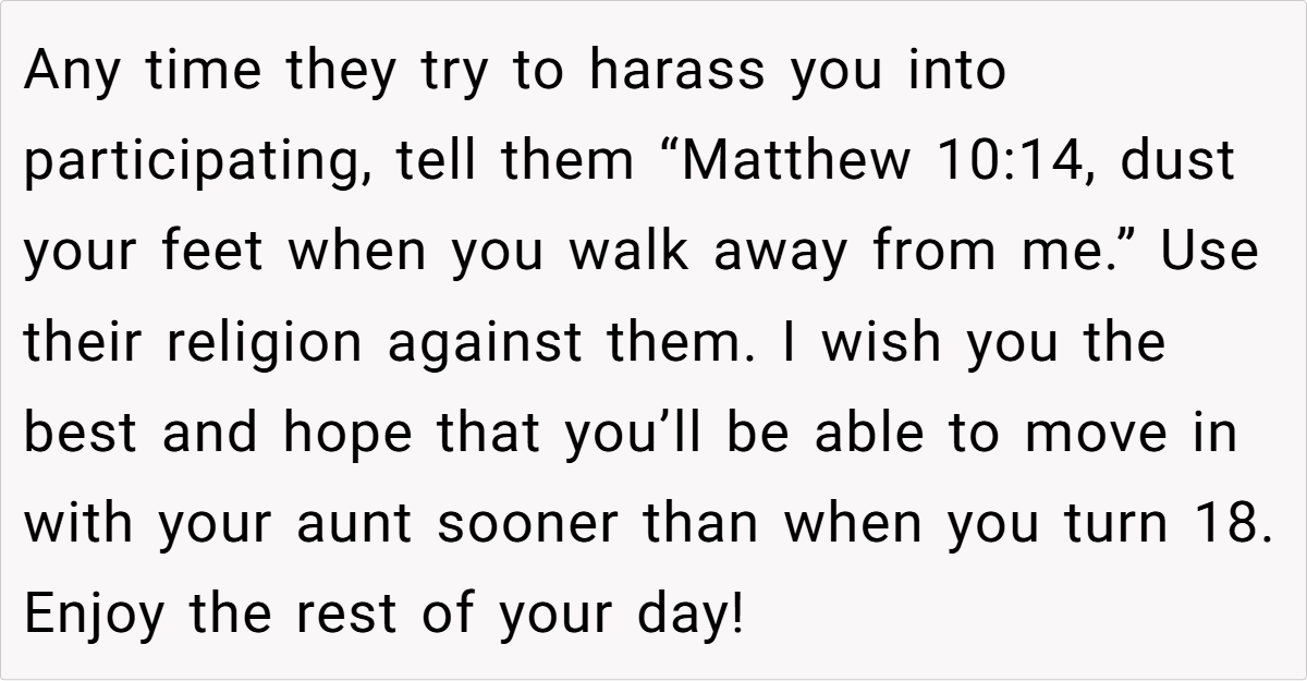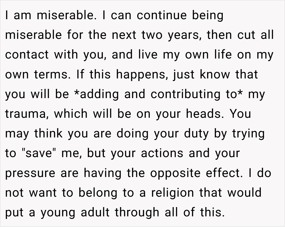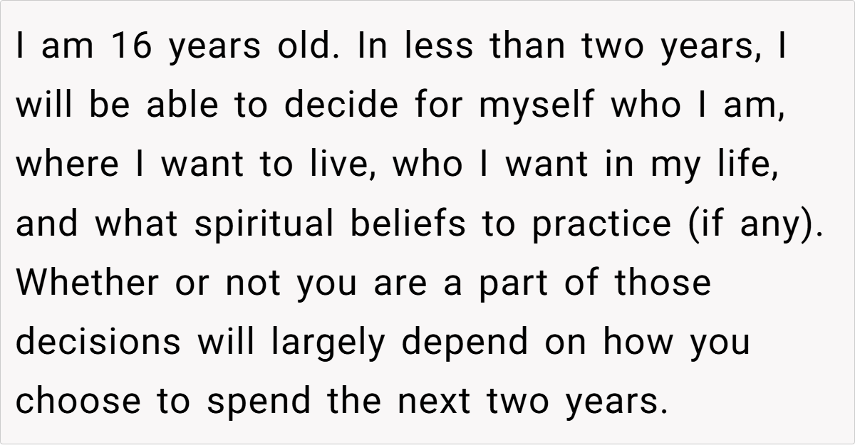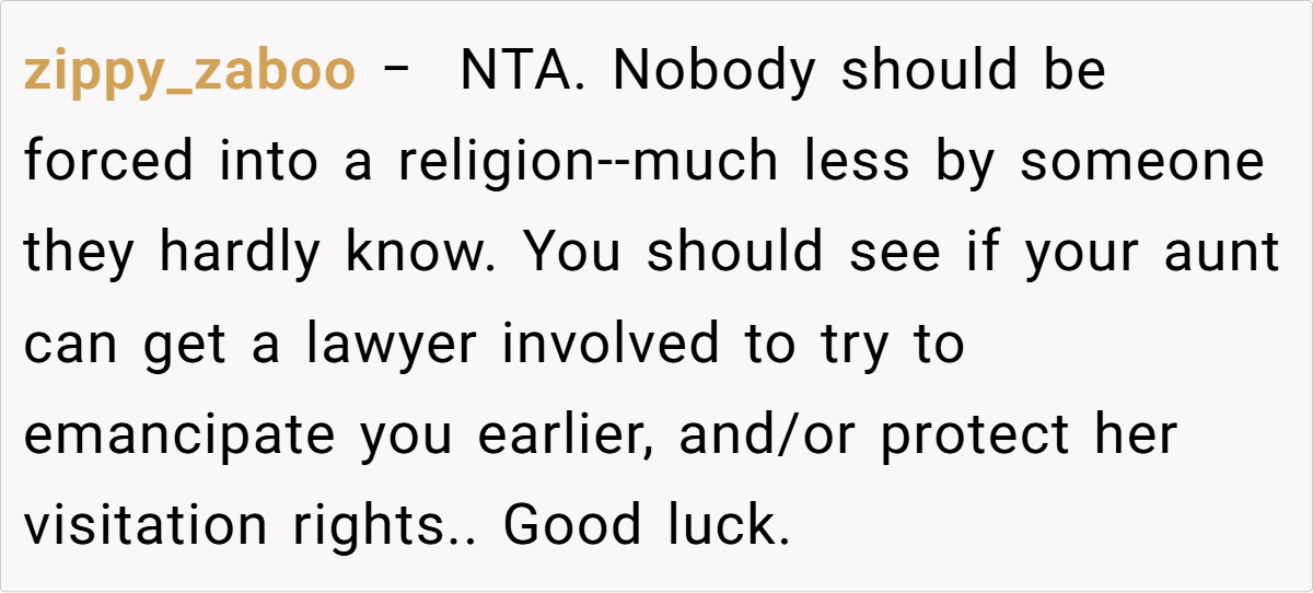 In this case, forcing religious indoctrination in a time of grief and upheaval not only undermines the OP’s right to self-determination but also risks inflicting long-lasting emotional harm. When a young person is pressured to conform to beliefs that don’t resonate with them, it can lead to feelings of alienation and resentment that persist well into adulthood.