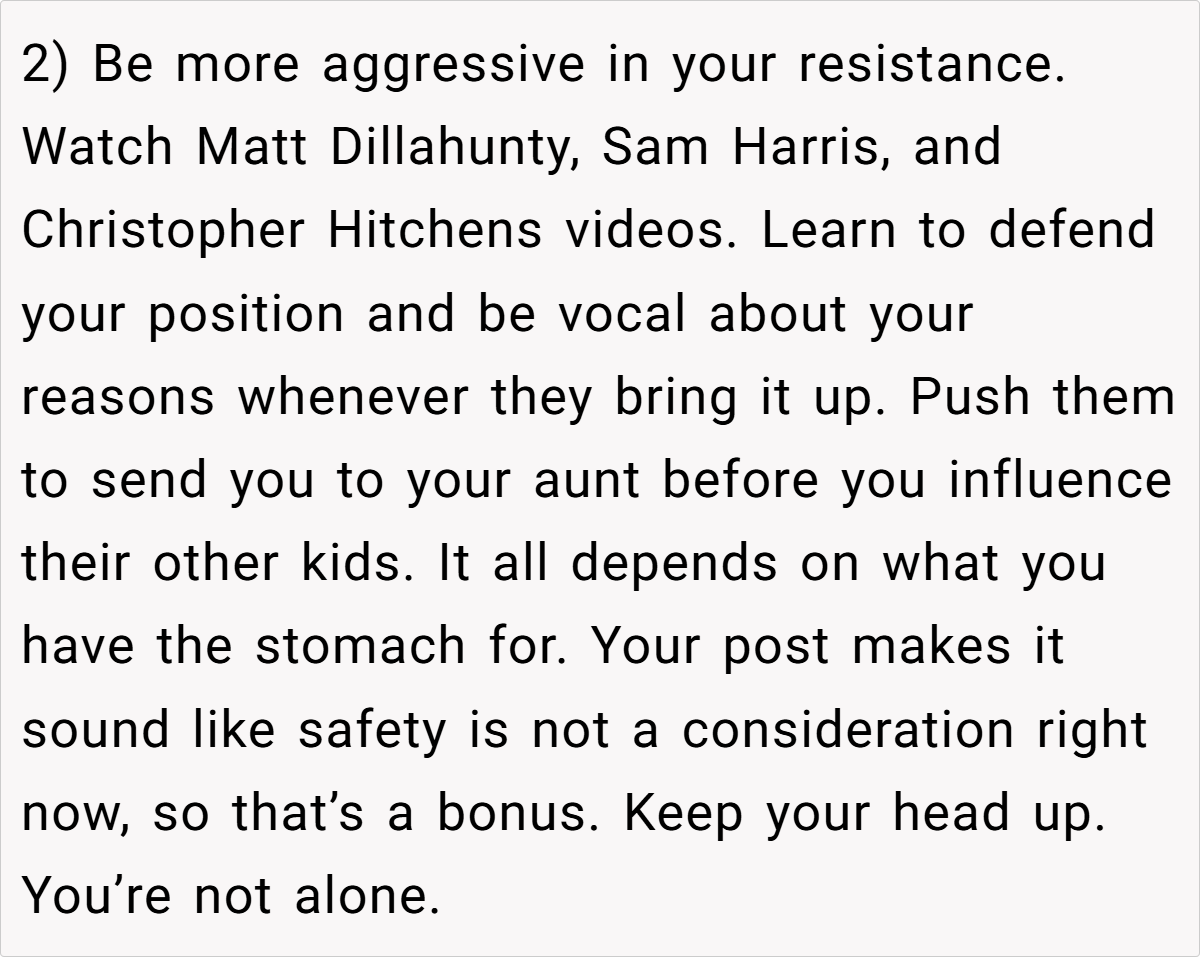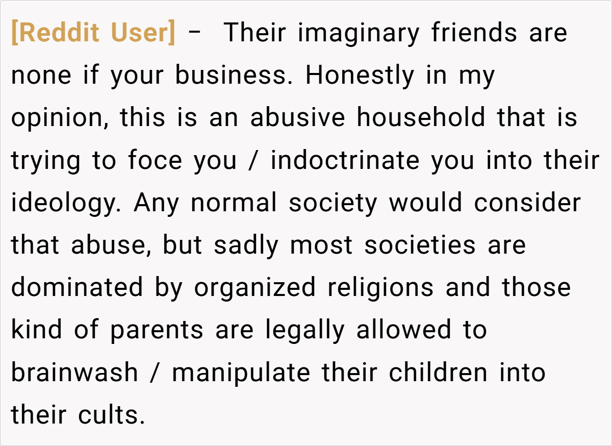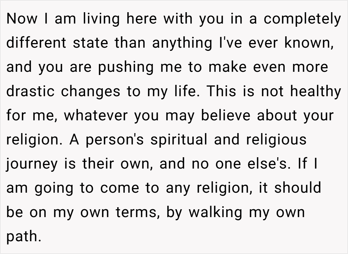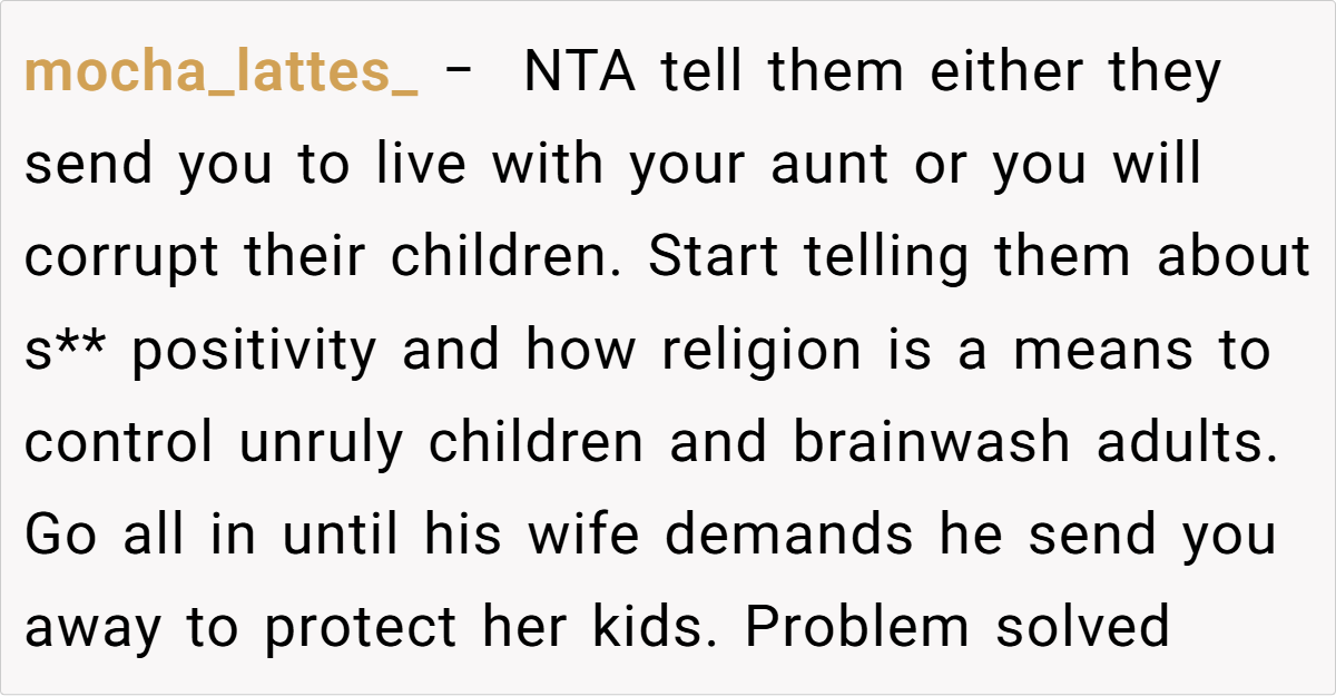In this case, forcing religious indoctrination in a time of grief and upheaval not only undermines the OP’s right to self-determination but also risks inflicting long-lasting emotional harm. When a young person is pressured to conform to beliefs that don’t resonate with them, it can lead to feelings of alienation and resentment that persist well into adulthood.