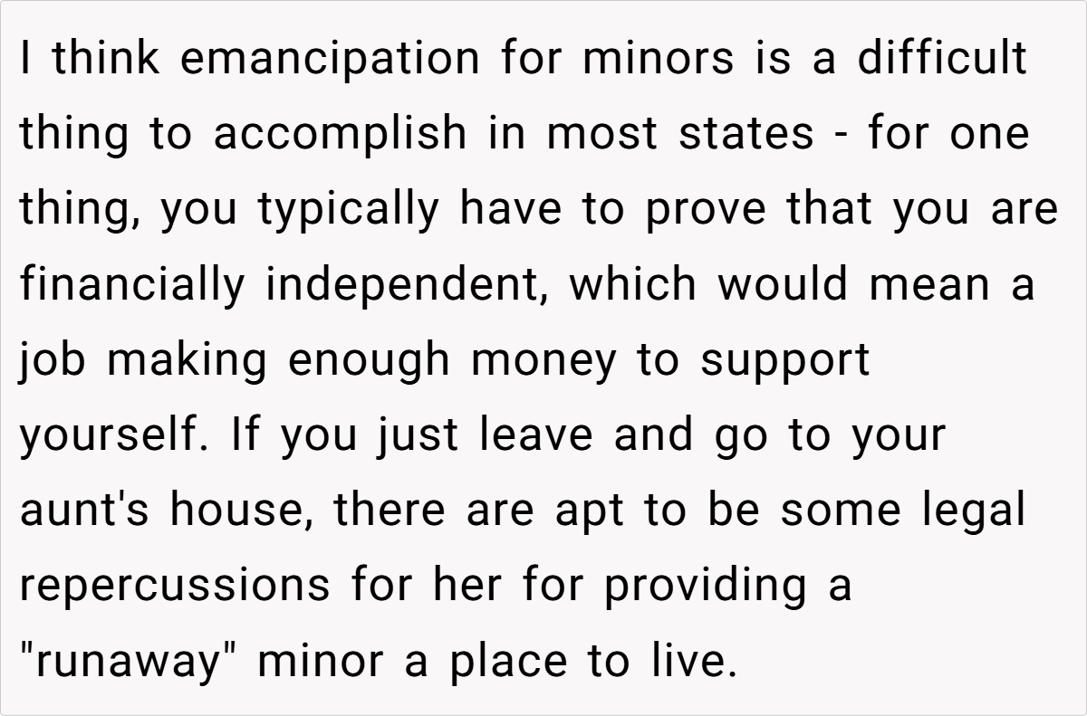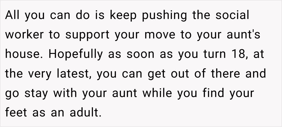 Moreover, experts advise that a supportive environment must validate the experiences of a traumatized youth rather than impose additional stressors. Legal guardians and caretakers should prioritize the emotional and mental health of the child by creating a space where open dialogue is encouraged. The OP’s expressed desire to live with his aunt—a person he feels connected to—should not be dismissed lightly, especially when it comes at the expense of his personal autonomy.