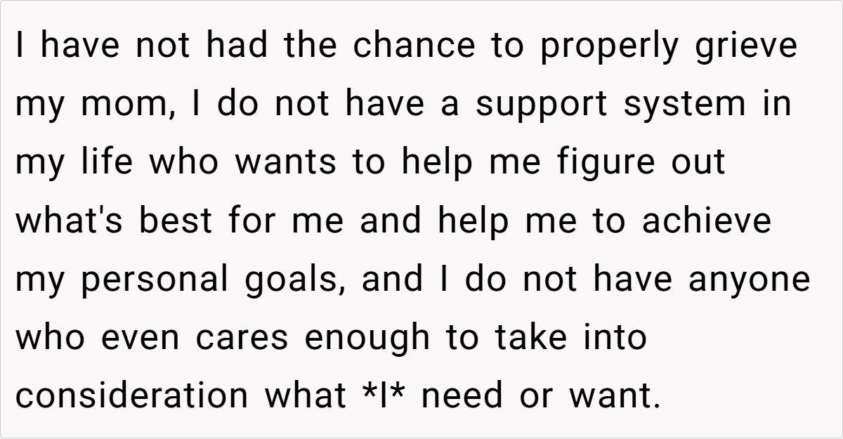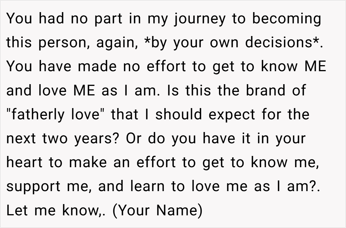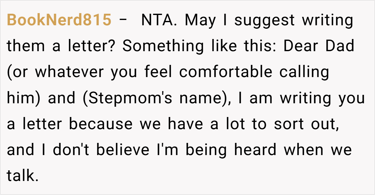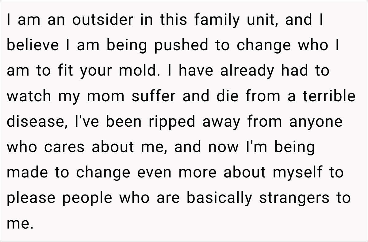 Ultimately, while legal systems often have their own rules, the true measure of care lies in respecting the child’s voice. The OP’s situation is a poignant example of how important it is to balance legal custody with genuine emotional support. Acknowledging and addressing these issues early on could make a significant difference in the long-term well-being of any child caught in such complex family dynamics.