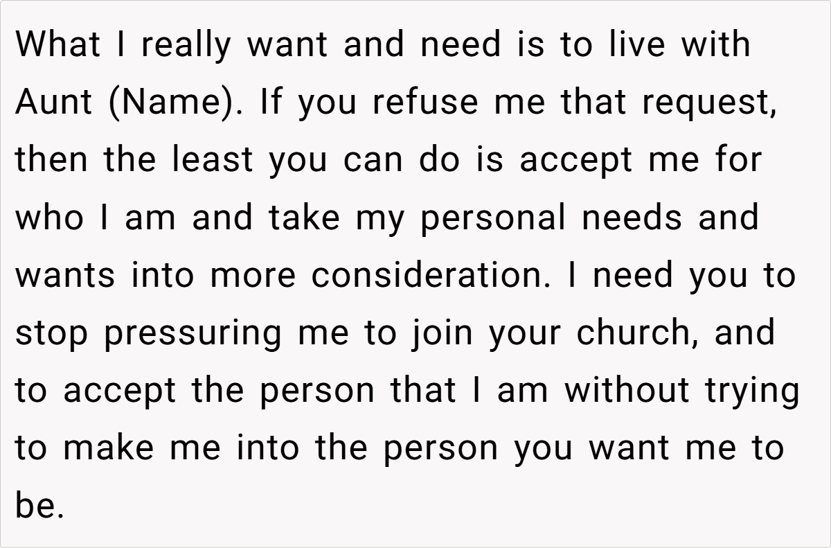 The OP’s struggle raises important questions: Should a young person’s voice be so easily overridden by custodial decisions? How can we better balance legal obligations with the genuine needs of a child? Share your thoughts and experiences in the comments below. What would you do if you were forced to live in an environment that conflicts with who you are?