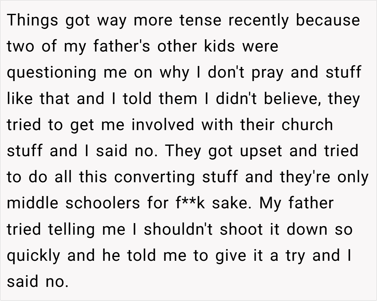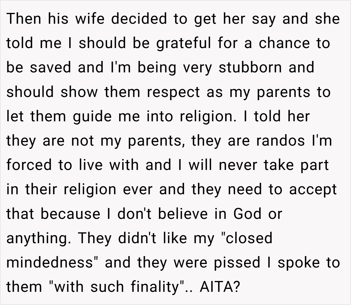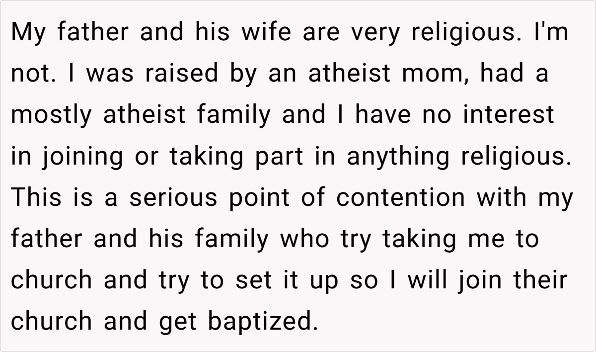 ‘AITA for telling my newfound father and his wife that I’m not going to take part in their religion ever?’