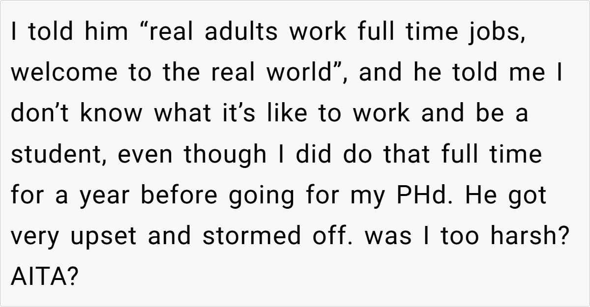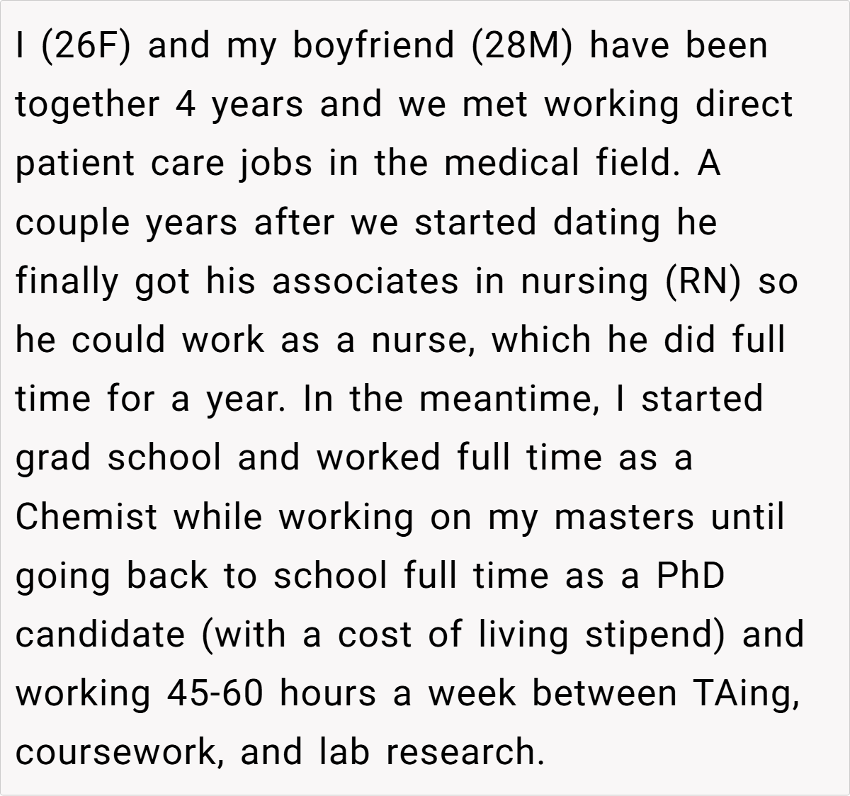 This is the situation a Reddit user finds herself in. After years of supporting her boyfriend through his educational journey, she now faces an unexpected dilemma—he wants to continue working part-time despite financial struggles. Feeling frustrated, she confronted him about the reality of adult responsibilities, which led to a heated argument. But was she too harsh? Or is she justified in expecting her partner to contribute more? Read her story below.