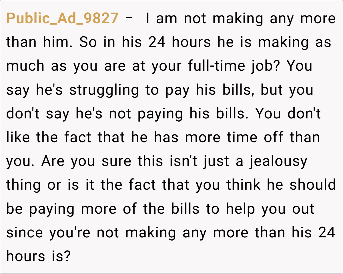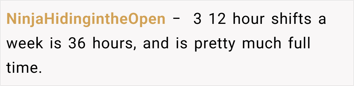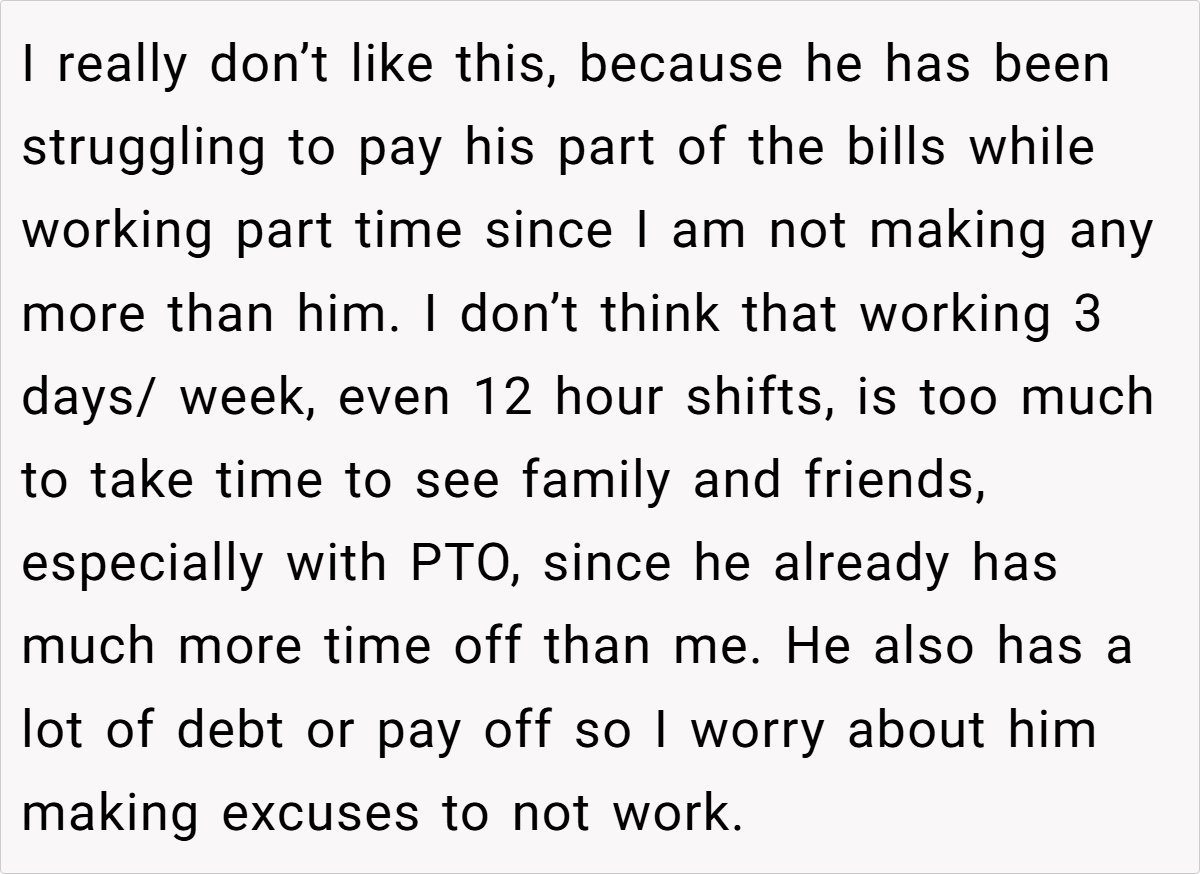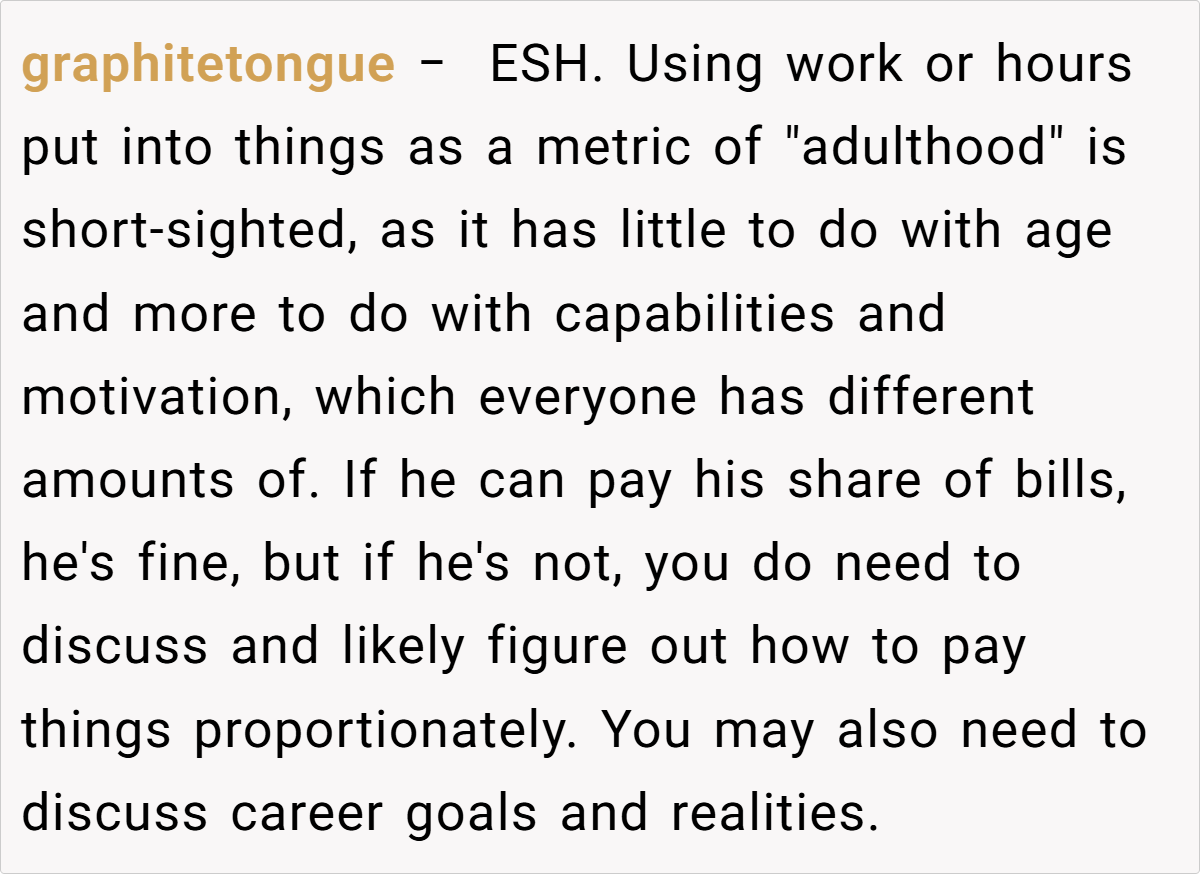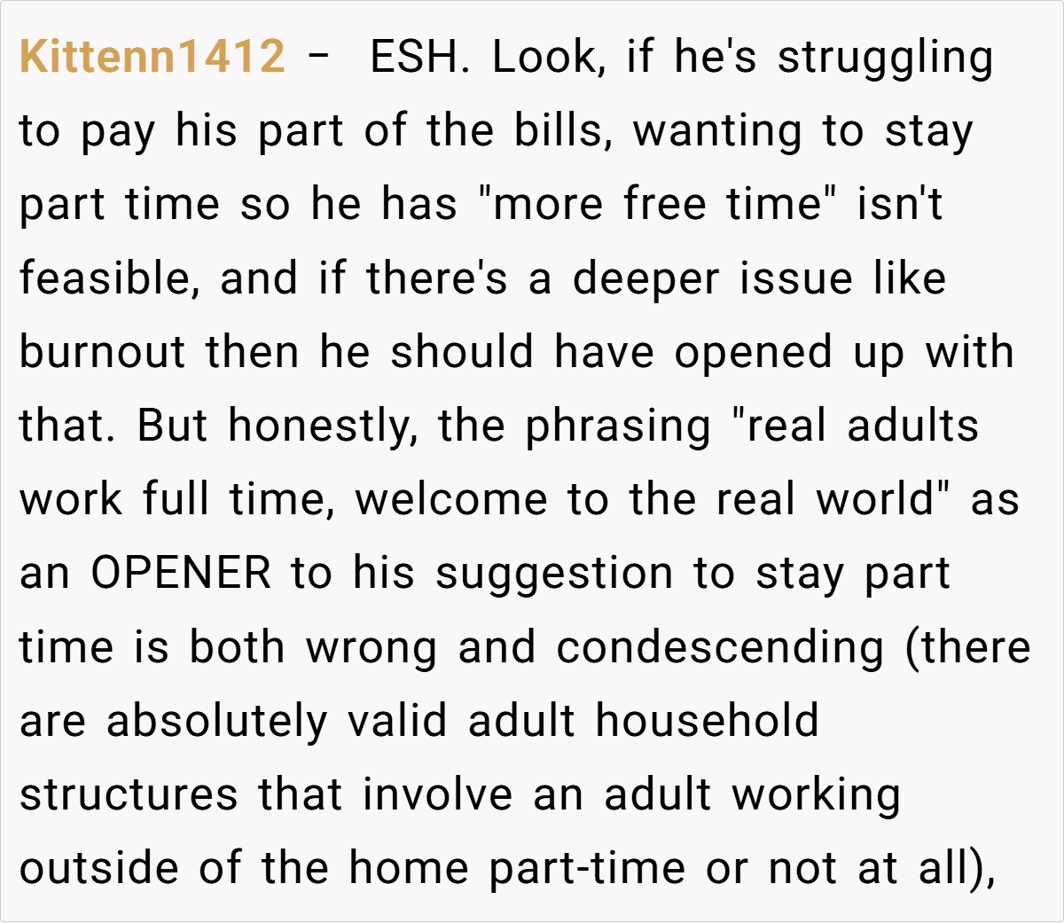 Some users pointed out that working three 12-hour shifts is still a significant workload, and full-time employment varies across industries. Others emphasized that if the boyfriend is struggling to pay bills, reducing work hours further is irresponsible. Several commenters also criticized OP’s wording, arguing that equating full-time work with “real adulthood” was dismissive and unnecessarily harsh.