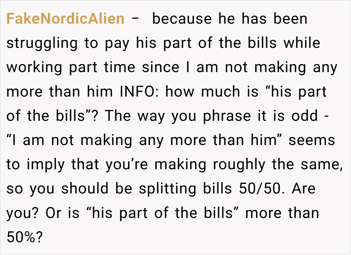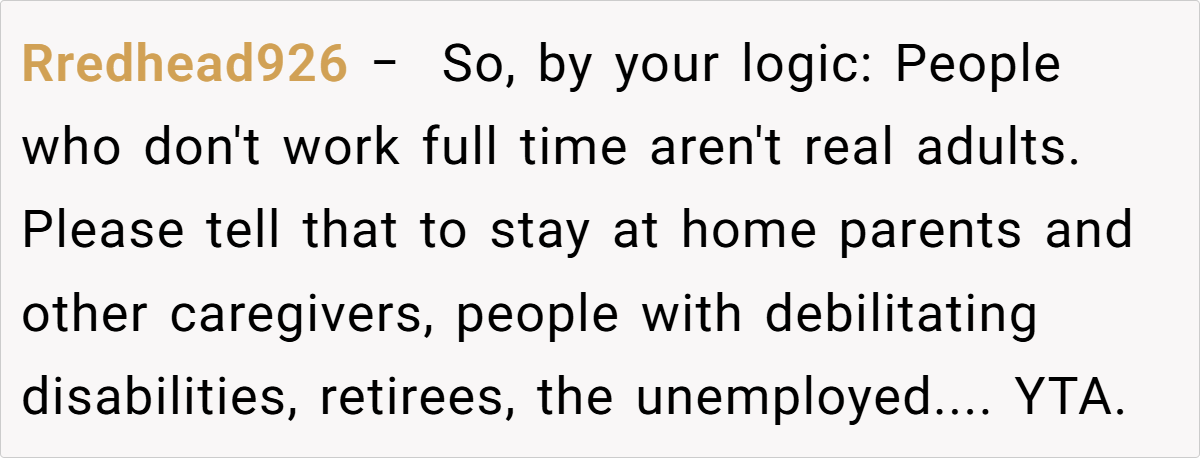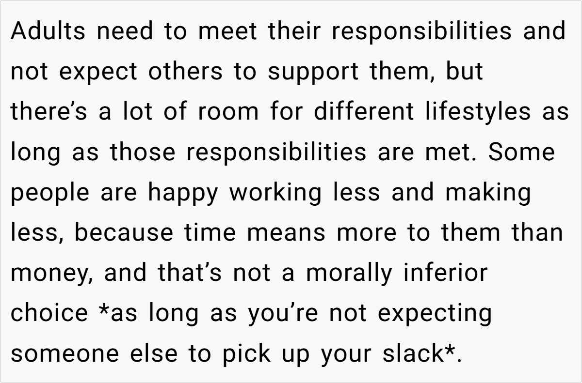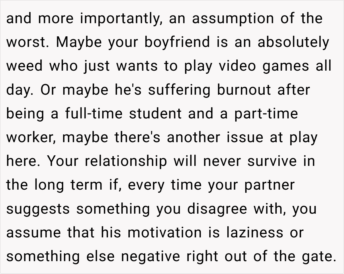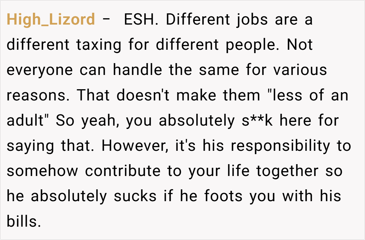 Some users pointed out that working three 12-hour shifts is still a significant workload, and full-time employment varies across industries. Others emphasized that if the boyfriend is struggling to pay bills, reducing work hours further is irresponsible. Several commenters also criticized OP’s wording, arguing that equating full-time work with “real adulthood” was dismissive and unnecessarily harsh.