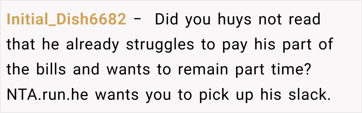 What’s your take? Would you expect your partner to work full-time in this situation? Or do you think work-life balance should come first? Share your thoughts in the comments below!