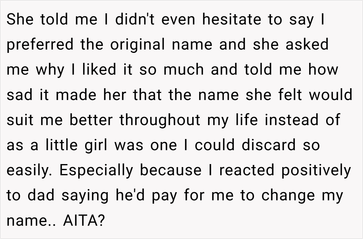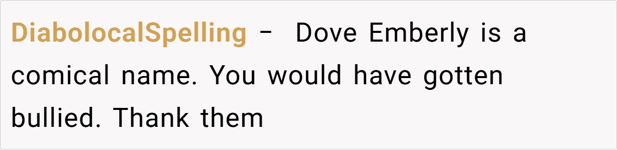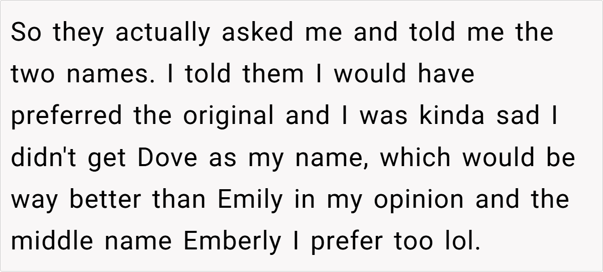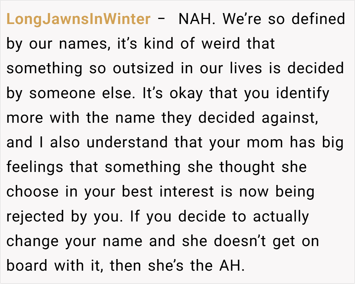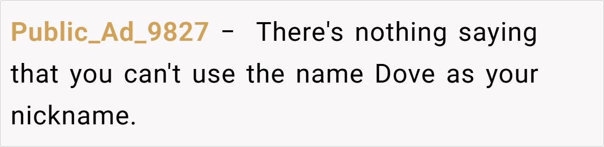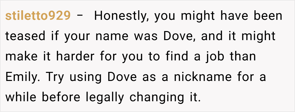 Many commenters agree that the daughter’s honest admission shouldn’t be seen as disrespectful, as parents should understand that personal identity evolves. Some suggest using “Dove” as a nickname while maintaining legal continuity, while others emphasize that names are subjective and fluid. The overall sentiment is that while the mother’s hurt feelings are understandable, the daughter’s desire for a unique identity is valid and reflects a natural part of growing up.