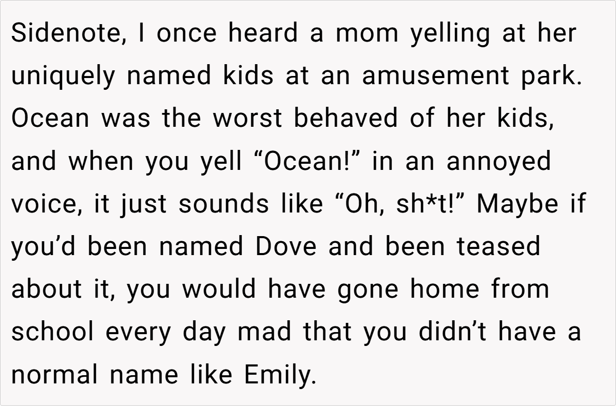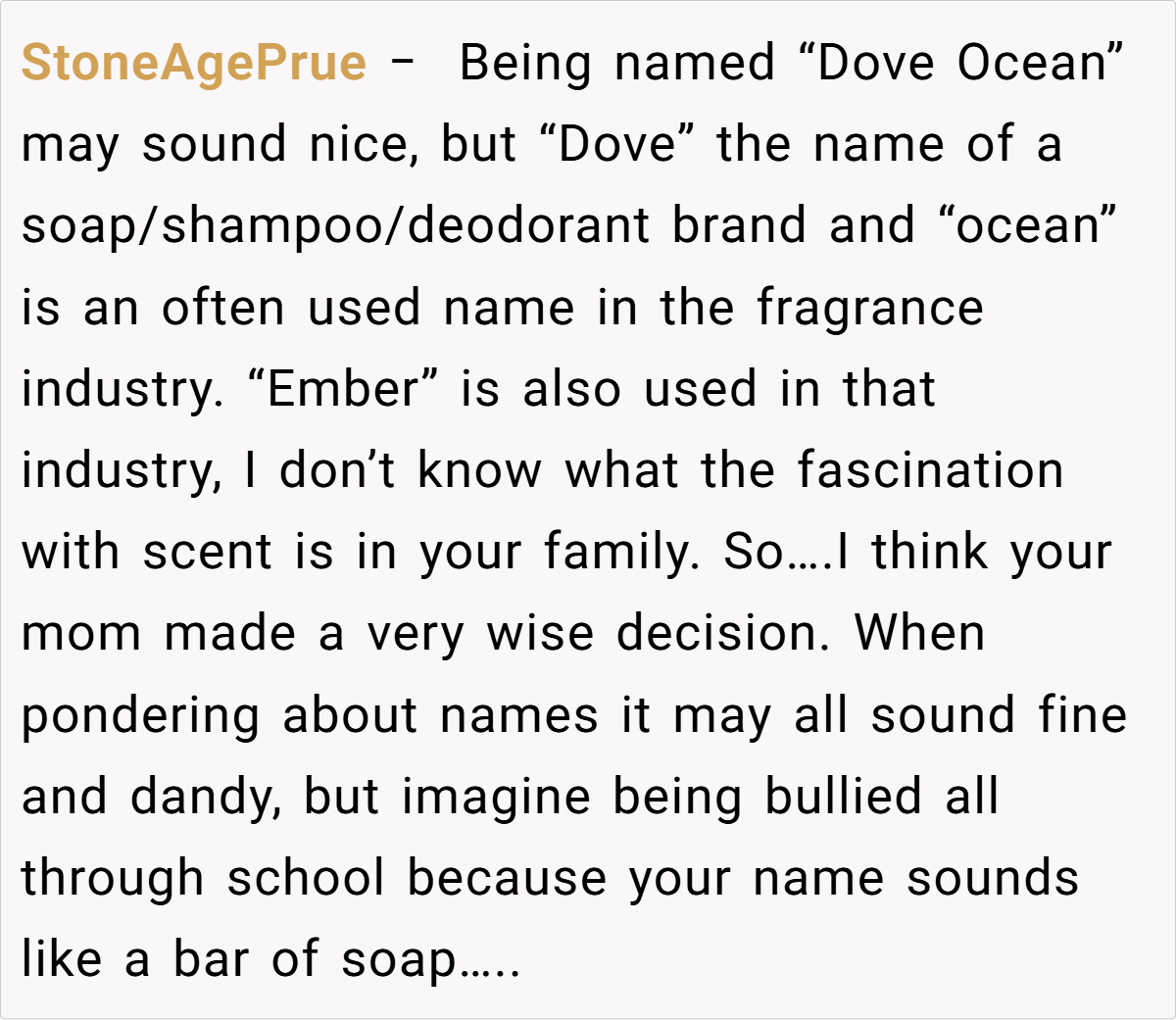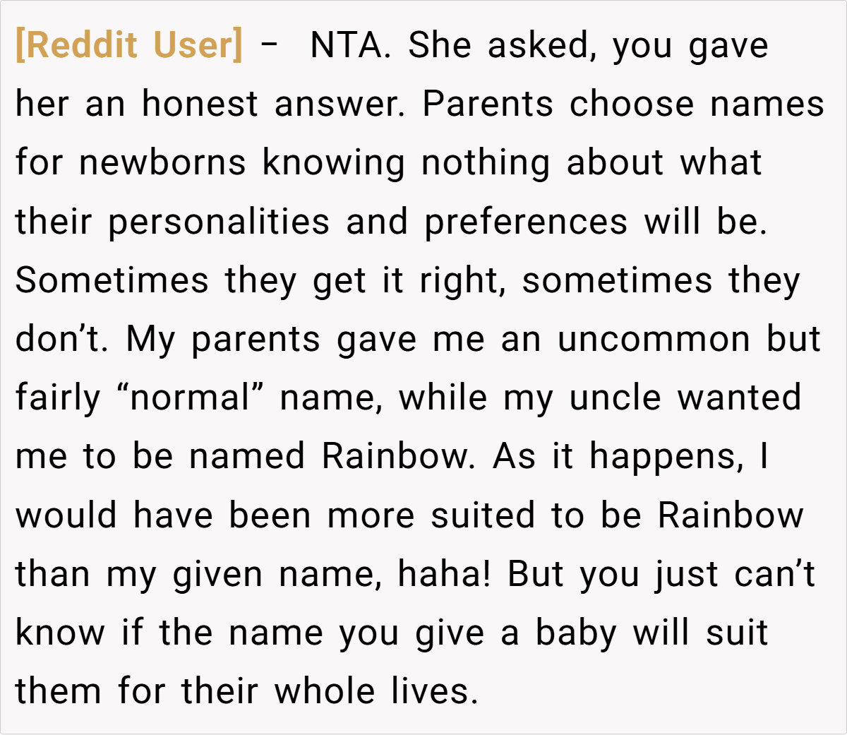 Many commenters agree that the daughter’s honest admission shouldn’t be seen as disrespectful, as parents should understand that personal identity evolves. Some suggest using “Dove” as a nickname while maintaining legal continuity, while others emphasize that names are subjective and fluid. The overall sentiment is that while the mother’s hurt feelings are understandable, the daughter’s desire for a unique identity is valid and reflects a natural part of growing up.