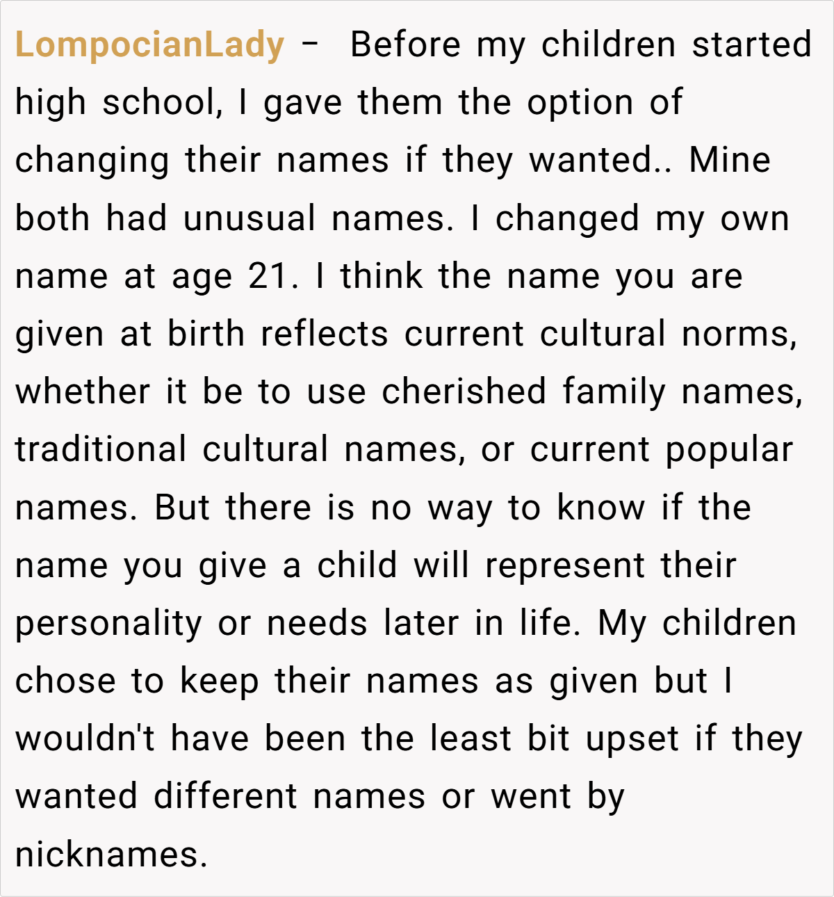 This story highlights the enduring impact that names have on our sense of self and the complexities of familial expectations. While the daughter’s preference for the original name opens up an important dialogue about individuality versus tradition, it also reminds us that names carry deep emotional significance for everyone involved.