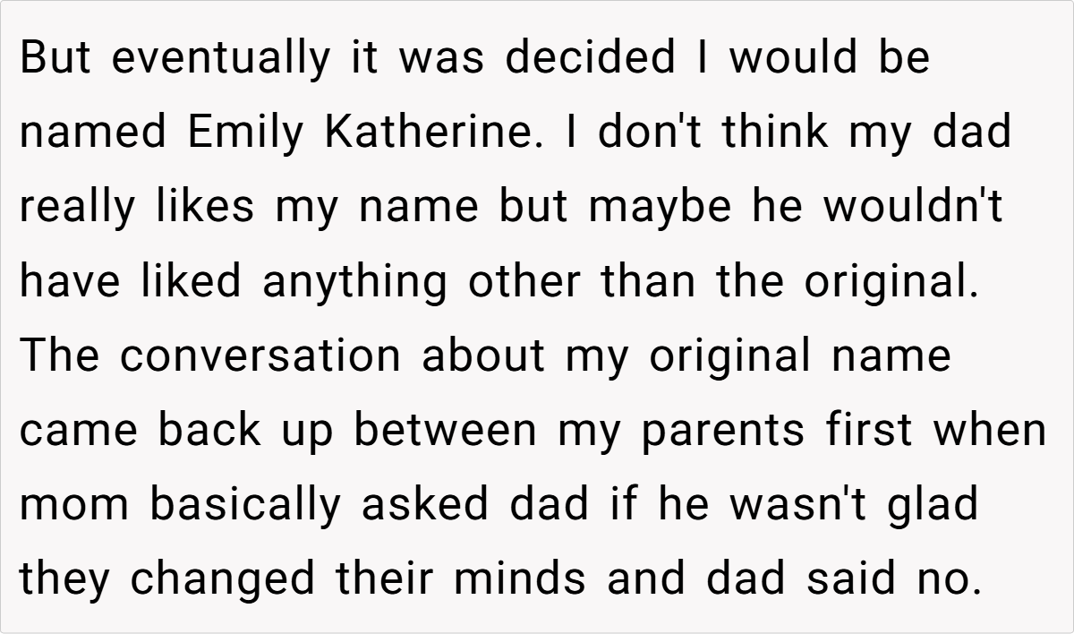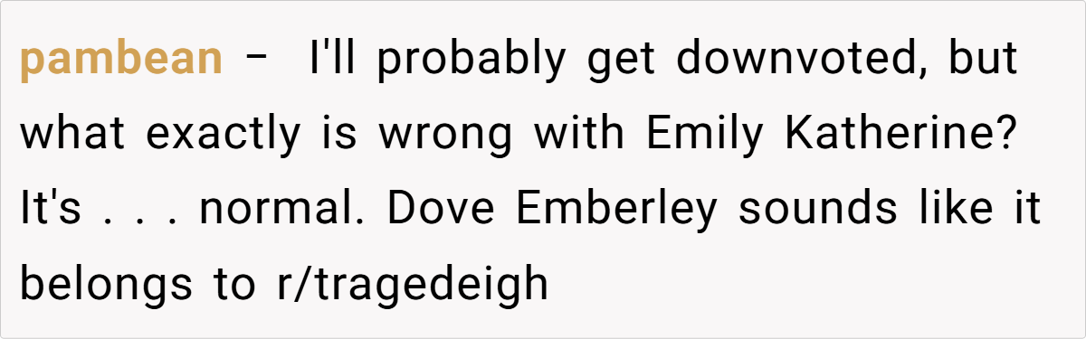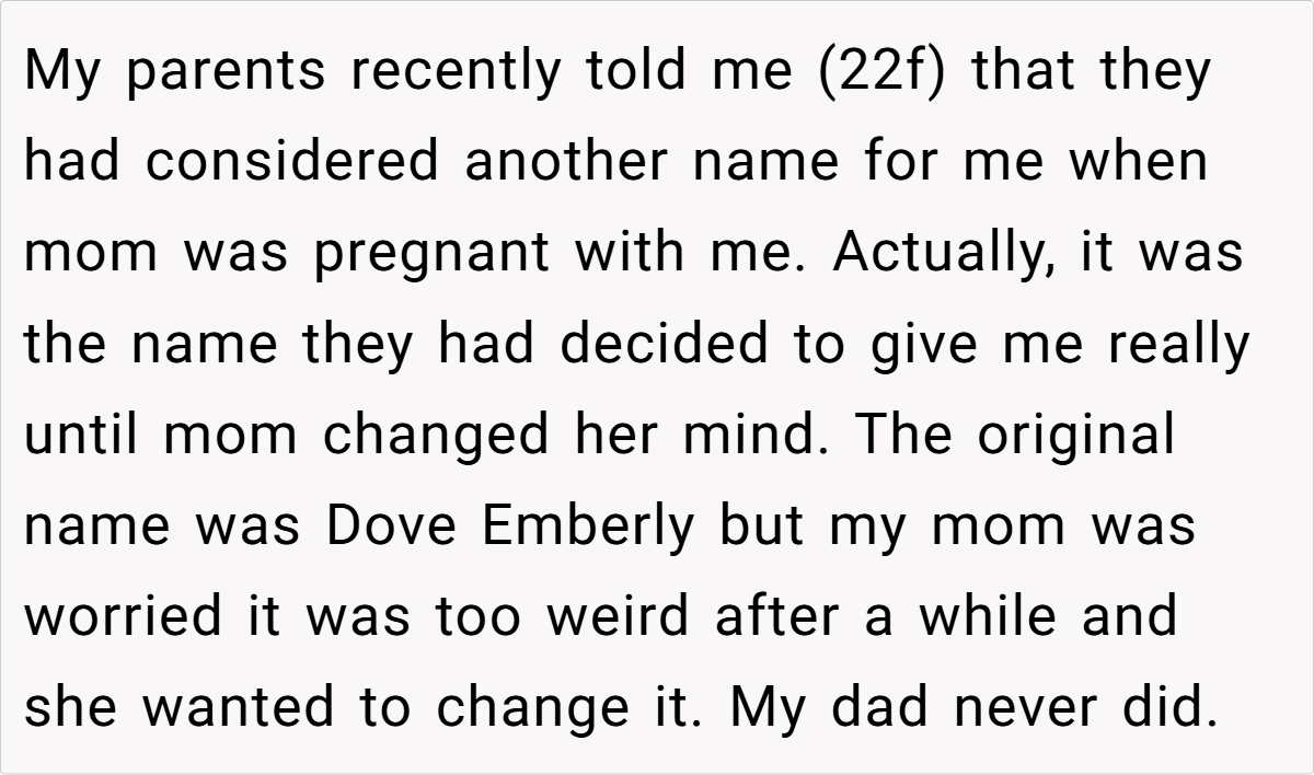 Names are more than just words; they often shape our identities and carry the weight of our family’s hopes and dreams. For one 22-year-old woman, learning about the original name her parents had chosen for her stirred up a mix of excitement and nostalgia—yet it also sparked an unexpected family conflict. When her parents revealed that “Dove Emberly” was once planned for her instead of “Emily Katherine,” she candidly admitted she would have preferred the original, a confession that hit a nerve at home.