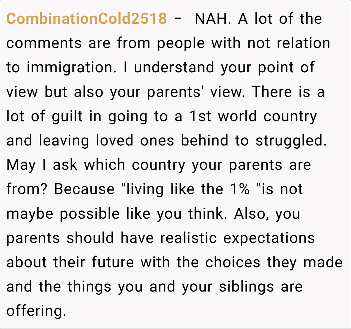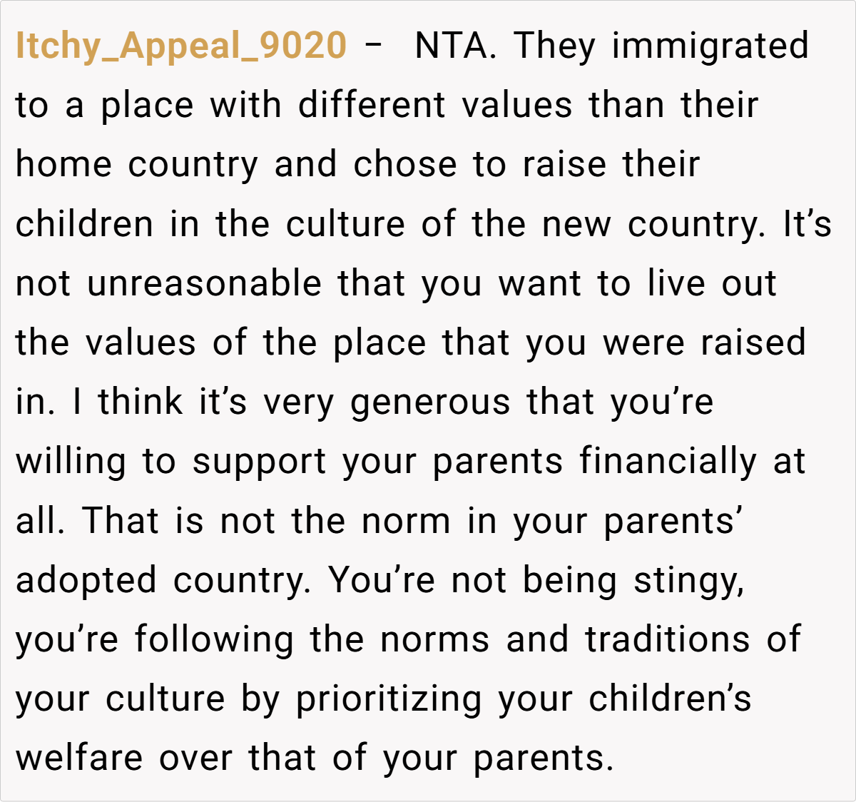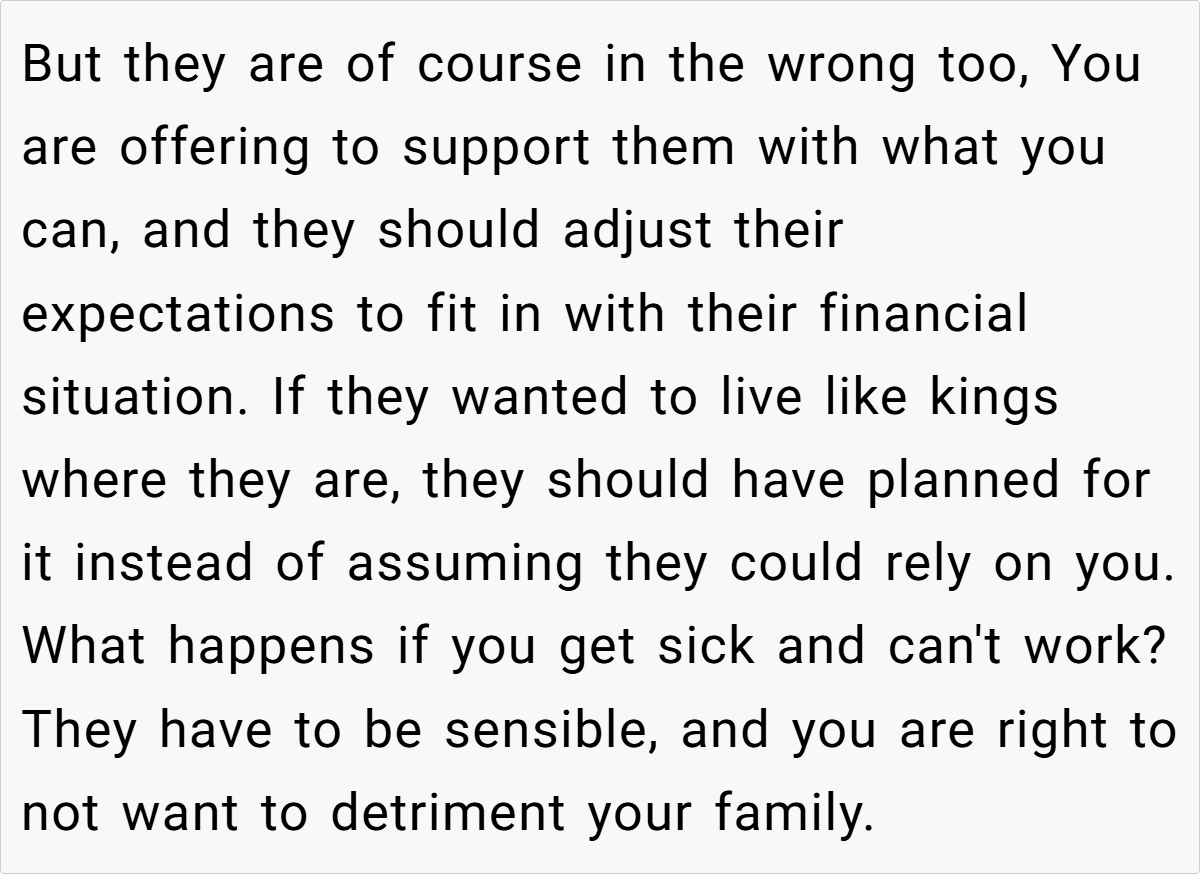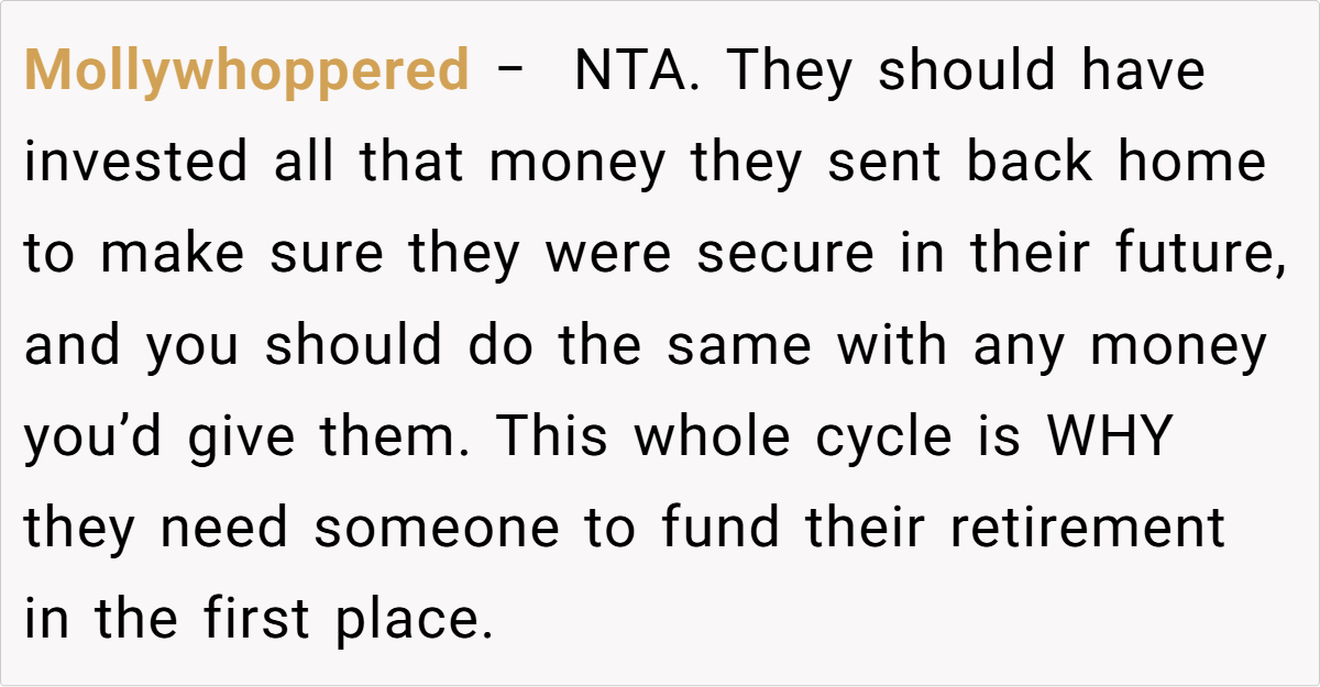Most Redditors back OP’s stance, arguing that if the parents wanted a lavish retirement in their home country, they should have planned for it. They believe it’s unreasonable for the next generation to shoulder such financial burdens and agree that OP is justified in setting clear boundaries. While a few acknowledge the complexities of family ties, the overall sentiment is that prioritizing one’s own family’s stability is both fair and necessary.