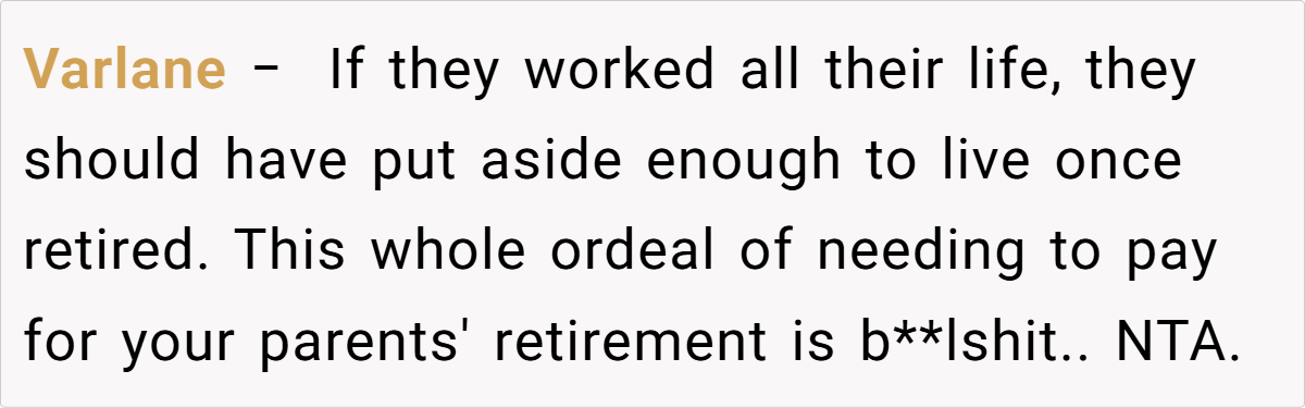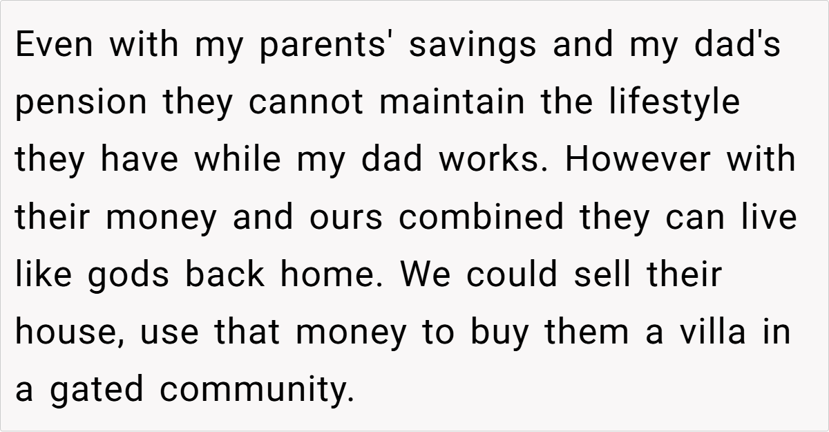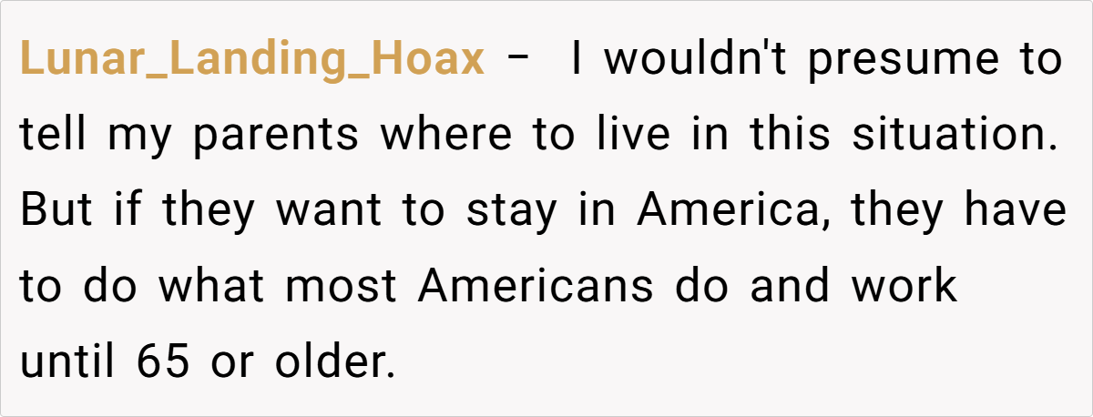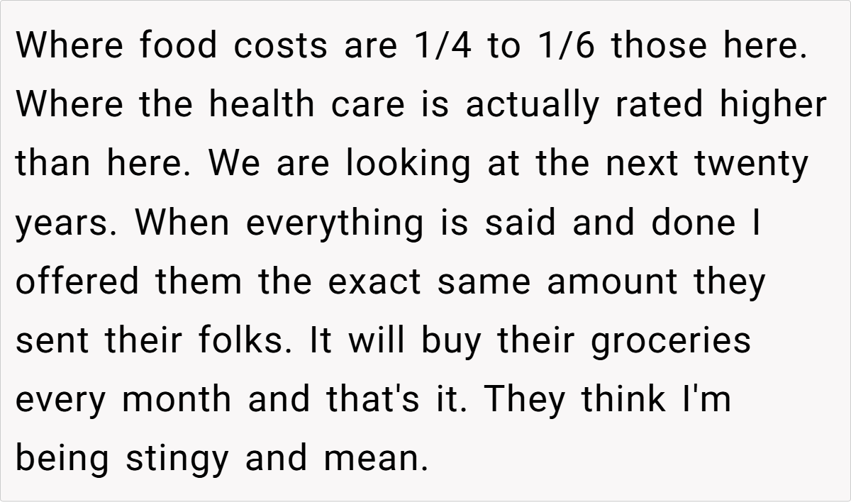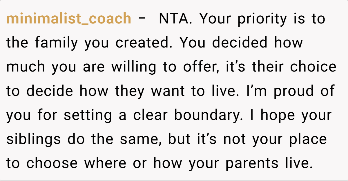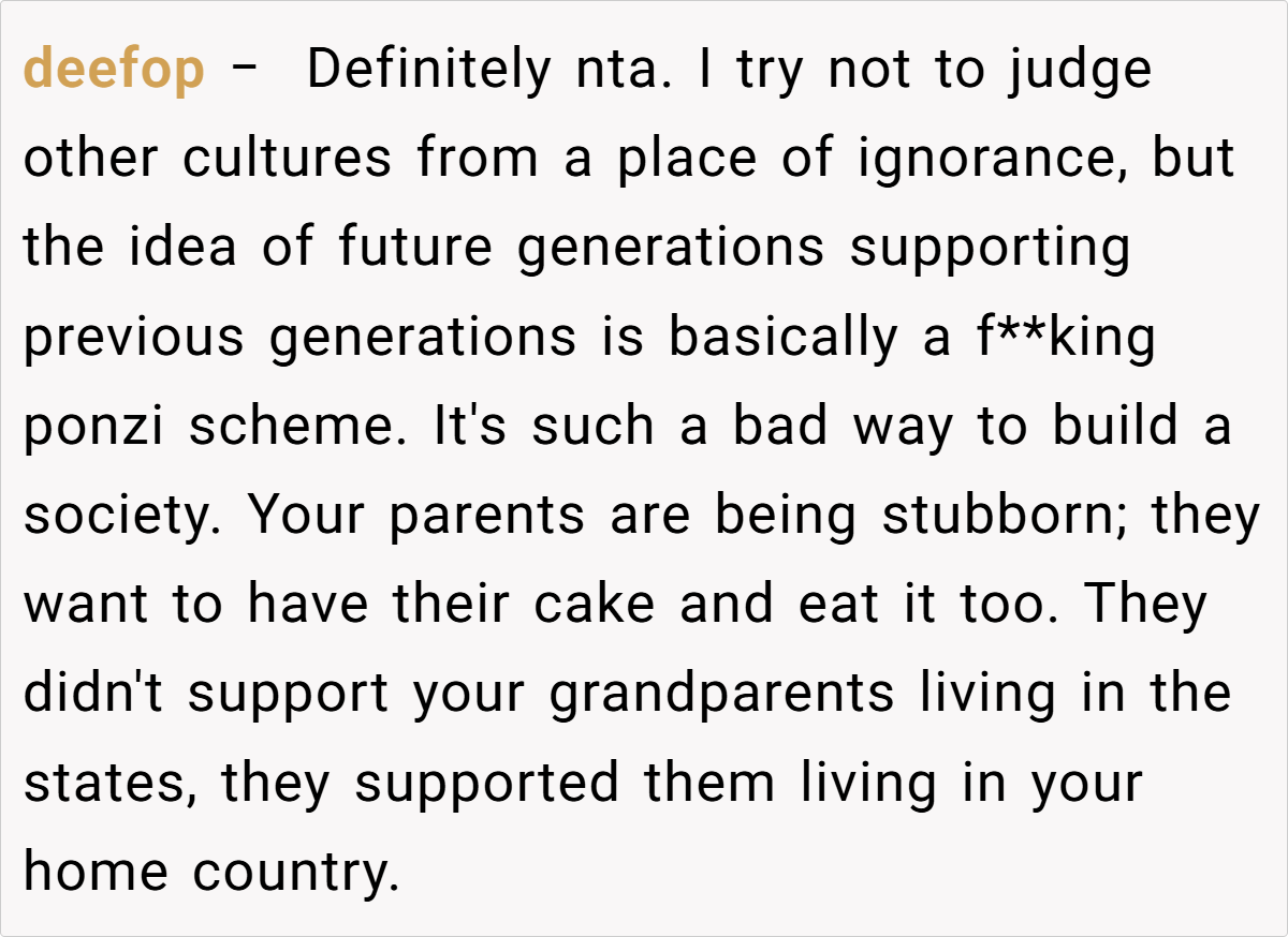 Most Redditors back OP’s stance, arguing that if the parents wanted a lavish retirement in their home country, they should have planned for it. They believe it’s unreasonable for the next generation to shoulder such financial burdens and agree that OP is justified in setting clear boundaries. While a few acknowledge the complexities of family ties, the overall sentiment is that prioritizing one’s own family’s stability is both fair and necessary.