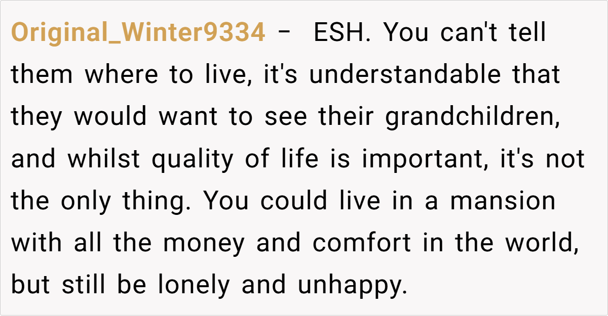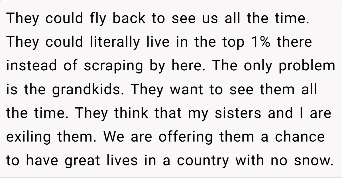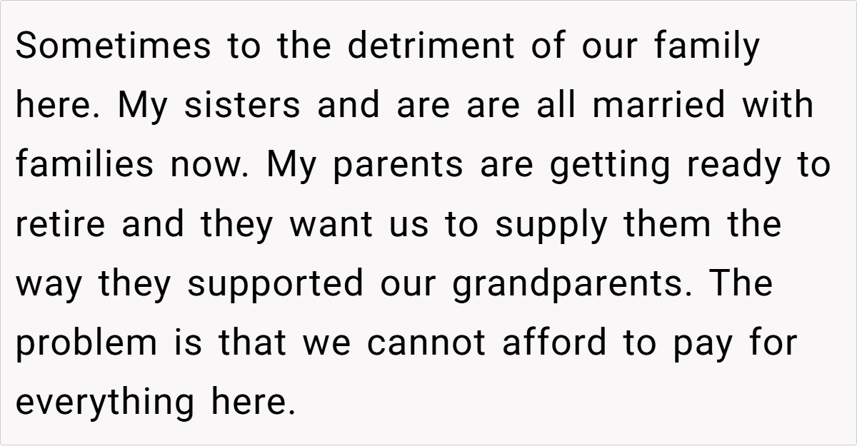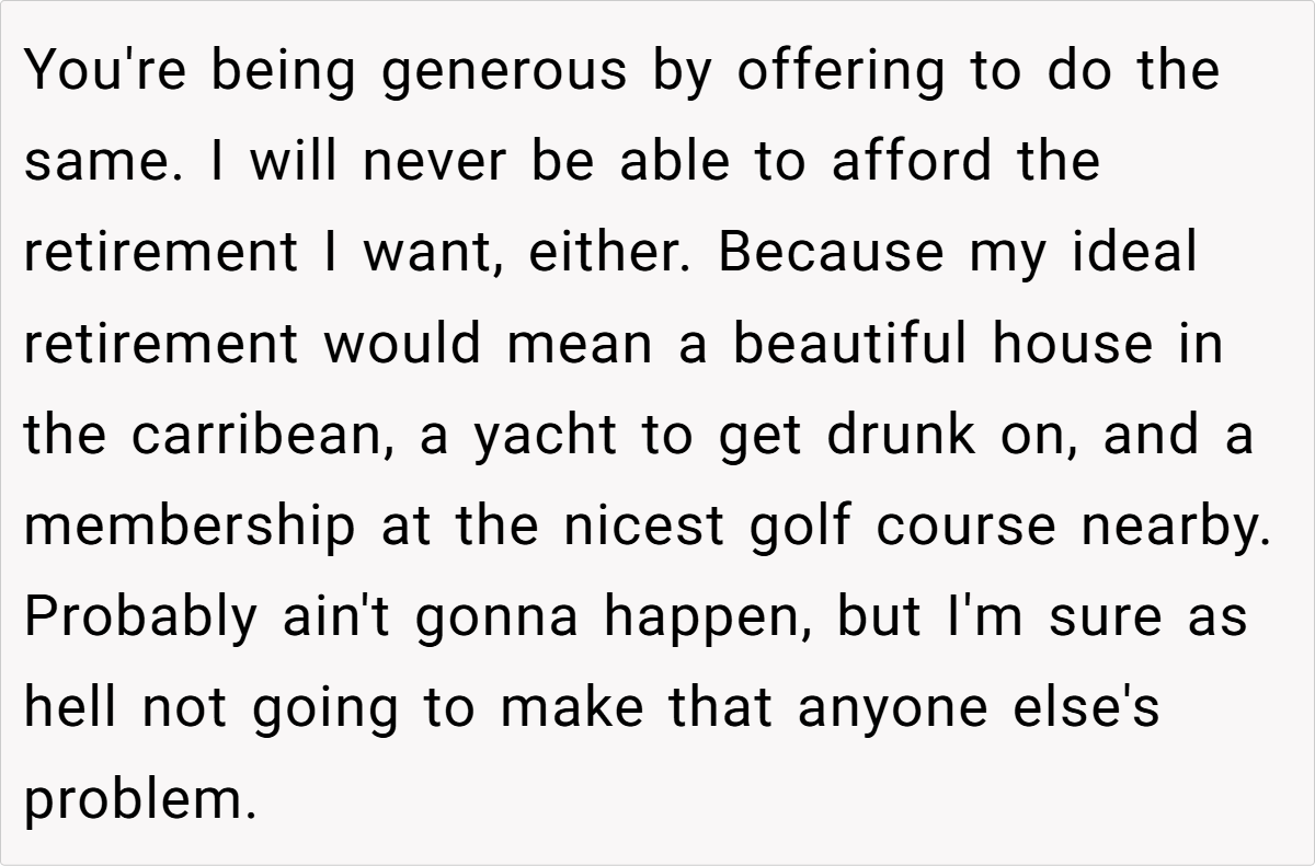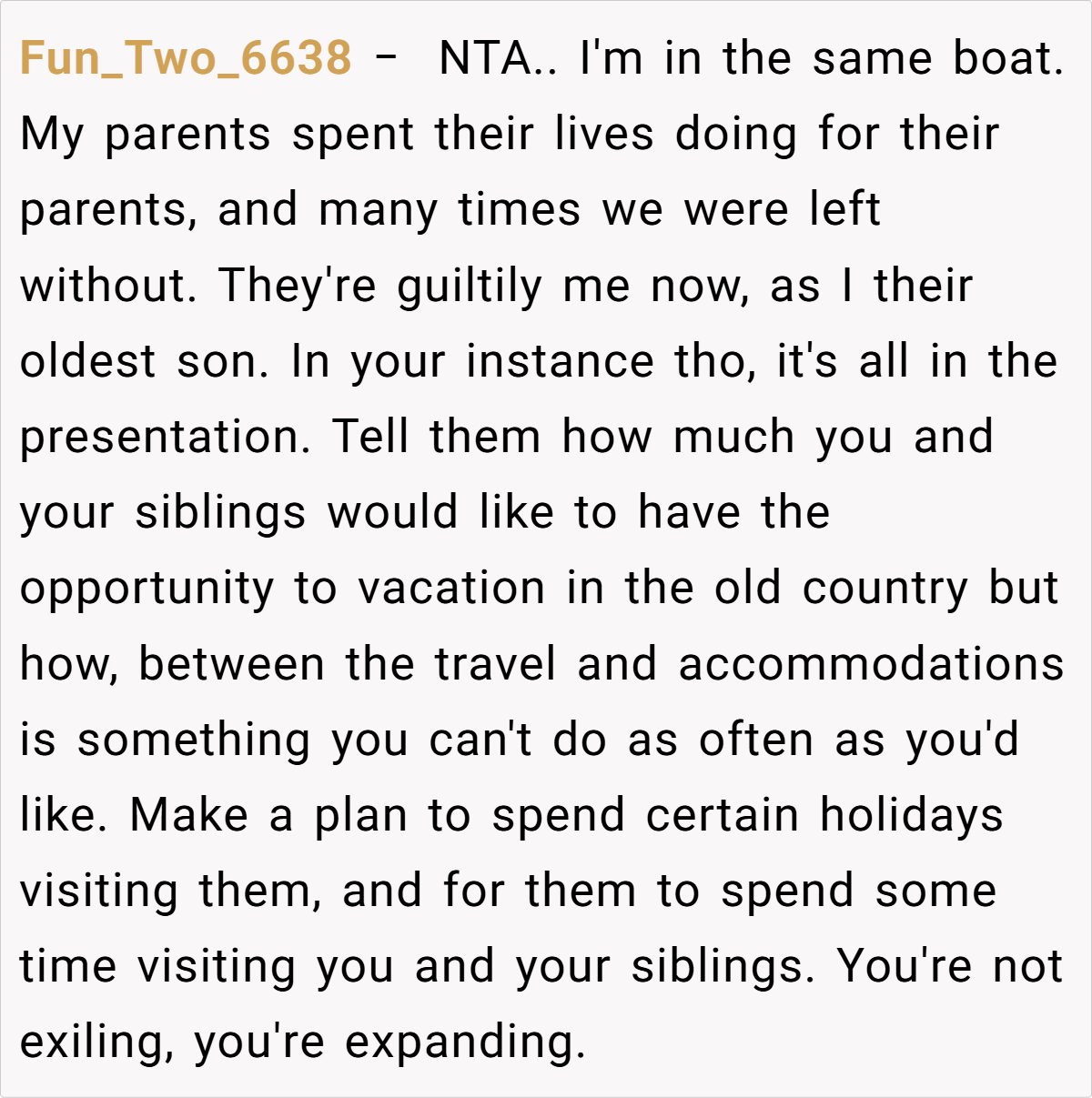 Most Redditors back OP’s stance, arguing that if the parents wanted a lavish retirement in their home country, they should have planned for it. They believe it’s unreasonable for the next generation to shoulder such financial burdens and agree that OP is justified in setting clear boundaries. While a few acknowledge the complexities of family ties, the overall sentiment is that prioritizing one’s own family’s stability is both fair and necessary.