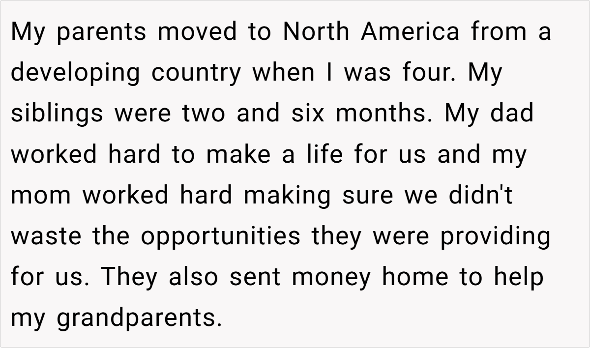 Growing up as the child of immigrant parents often means inheriting dreams, sacrifices, and sometimes, unexpected burdens. In this story, a devoted child recounts the tension between familial duty and financial reality. With parents who left their developing country in search of better opportunities, the promise of a prosperous future came with a price. Now facing retirement, the parents expect the same level of support they once provided for their own families—an expectation that strains the limited resources of their children.