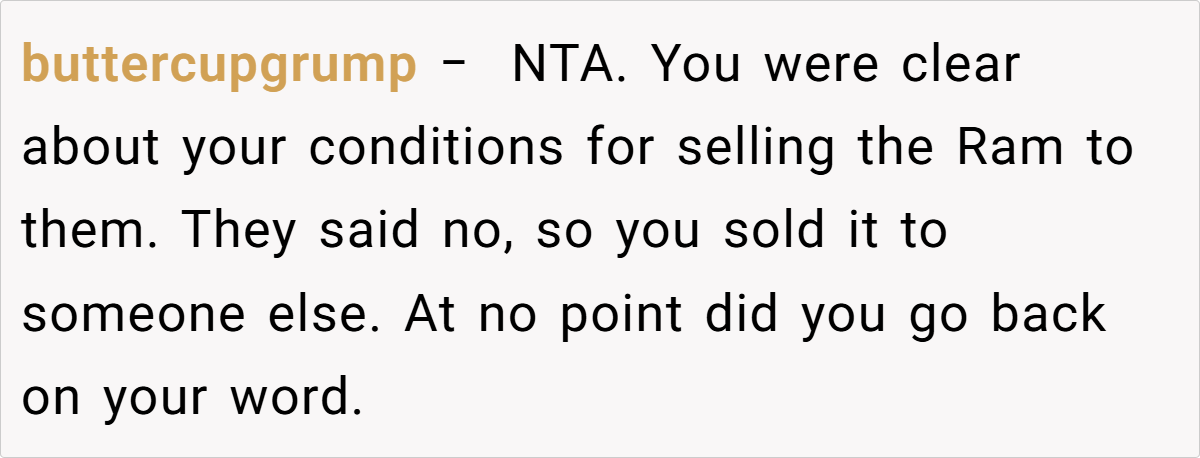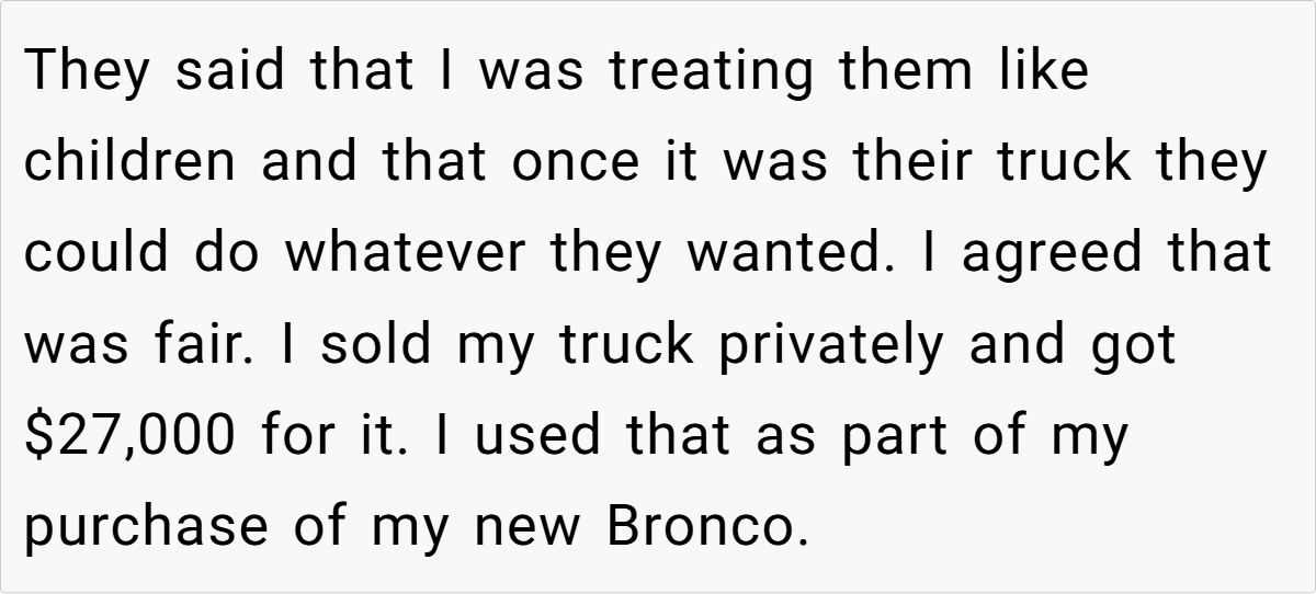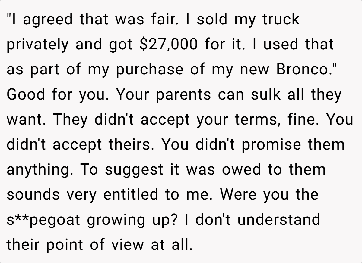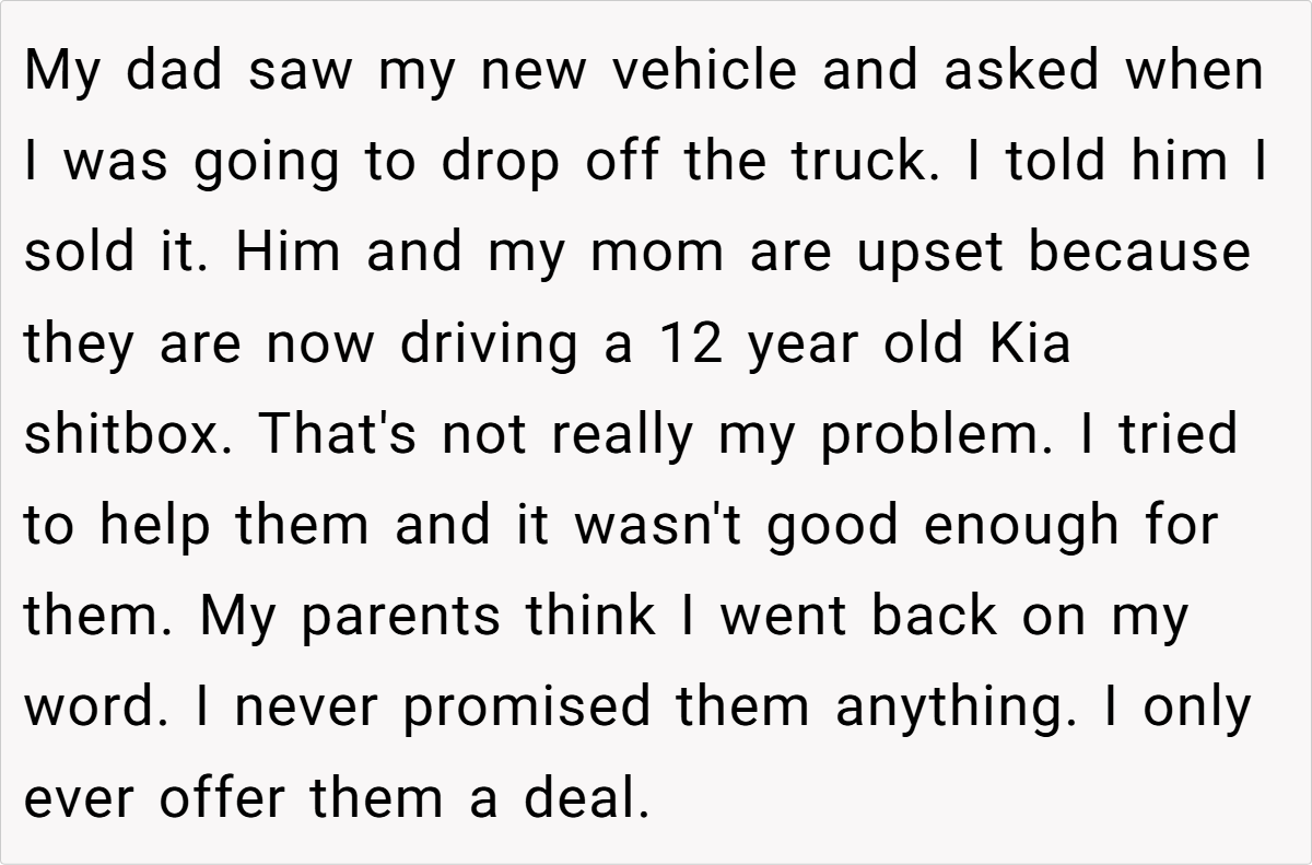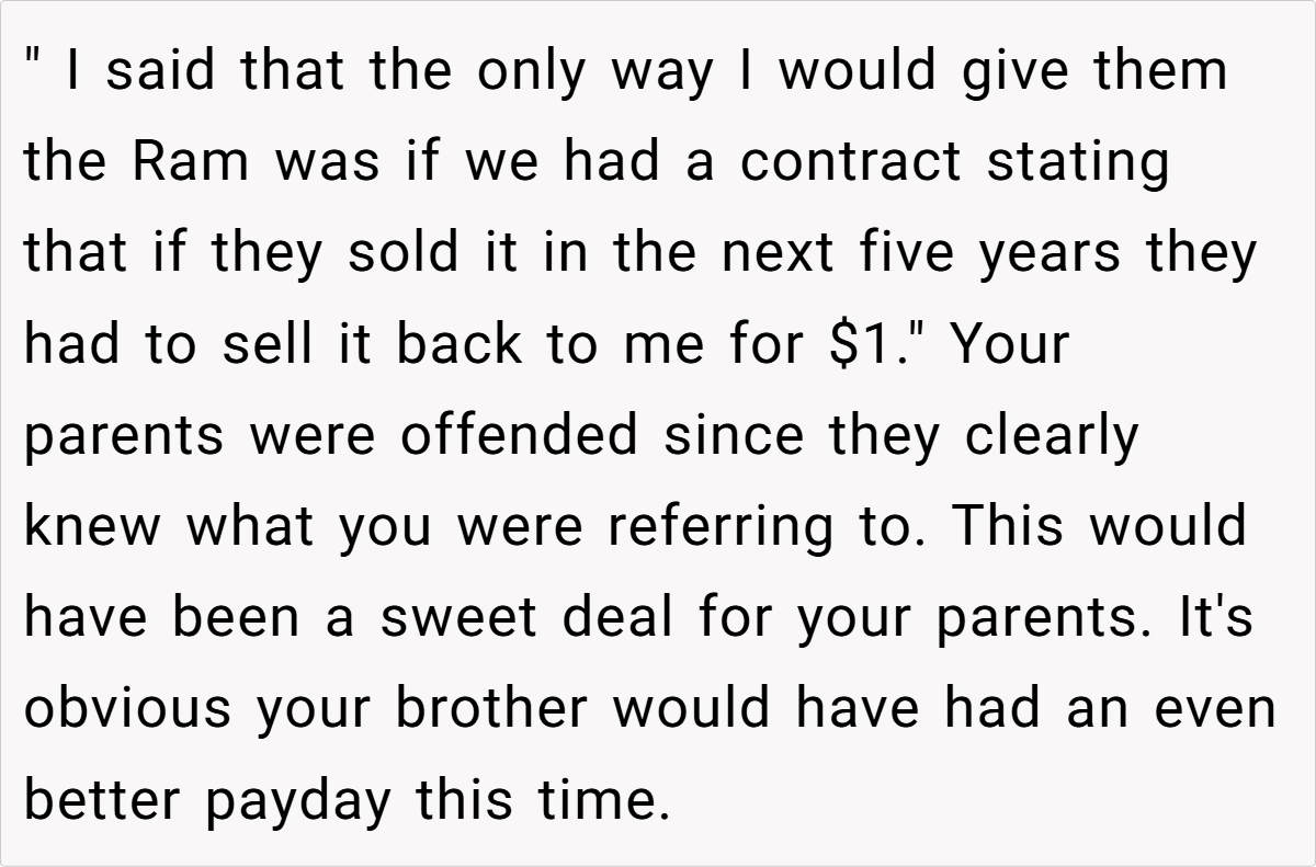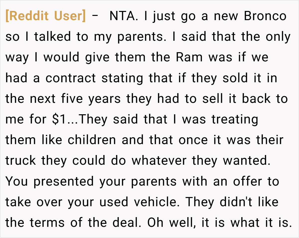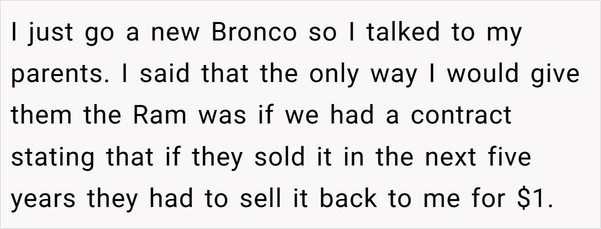 Setting boundaries with family—especially when money and personal assets are involved—can be as challenging as navigating a busy highway during rush hour. In this story, the OP’s offer was clear: if their parents ever sold the Ram within five years, they’d have to give it back for a nominal fee. This condition was meant to safeguard the value of the deal and ensure the parents enjoyed a trouble-free ride. Yet, when the offer was declined, the aftermath revealed deep-seated issues around control, entitlement, and generational expectations.