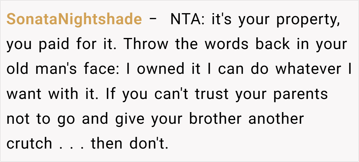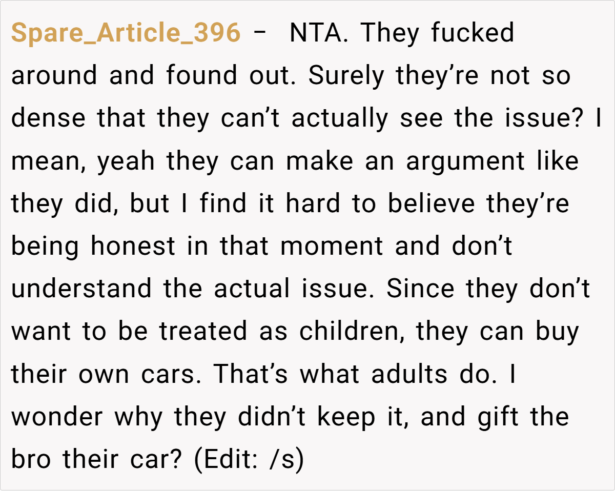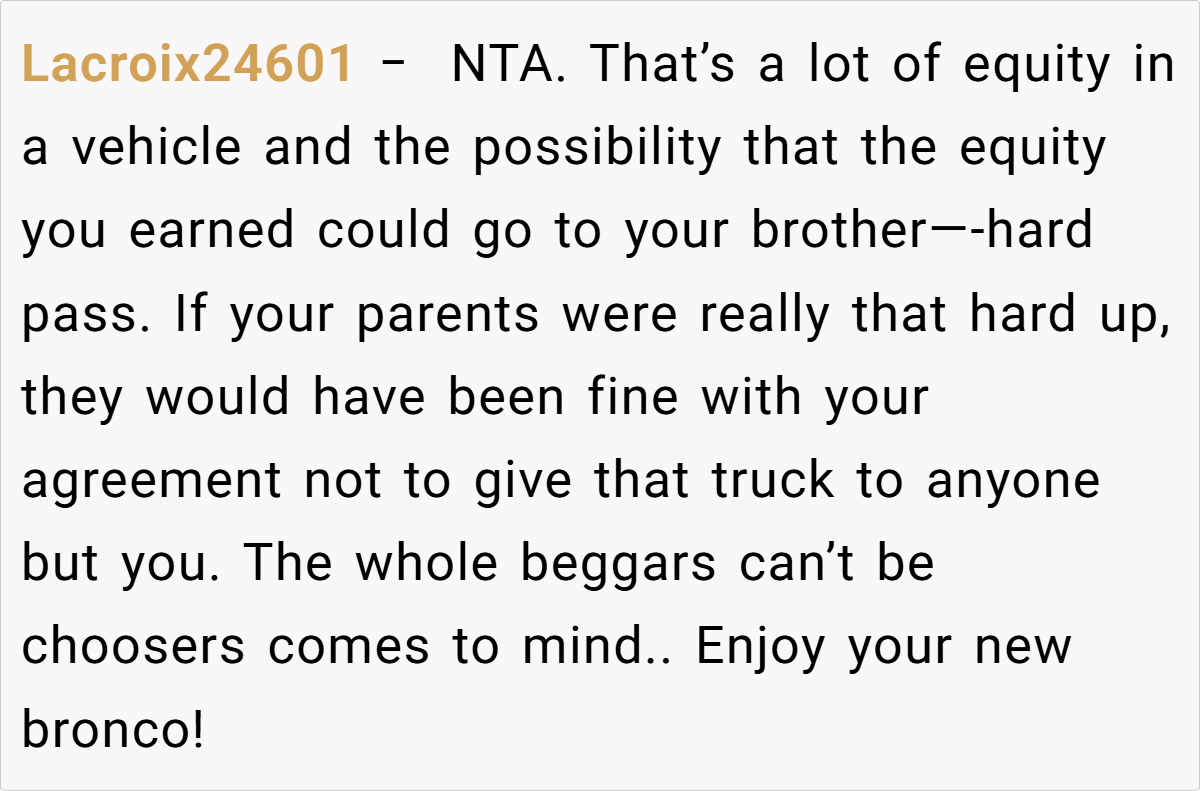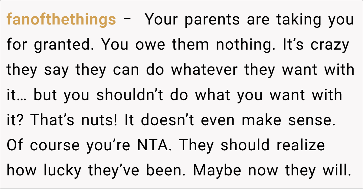 The Reddit community’s reaction was a mixed bag of humor, disbelief, and practical advice. Many commenters expressed support for the OP’s clear boundaries, noting that the offer was straightforward and fair, while others pointed out that family matters—especially those involving money—are never as simple as they seem. Overall, the general sentiment leans toward understanding the OP’s perspective, with many highlighting that the parents’ decision ultimately led to an outcome they had to accept.