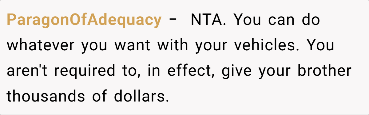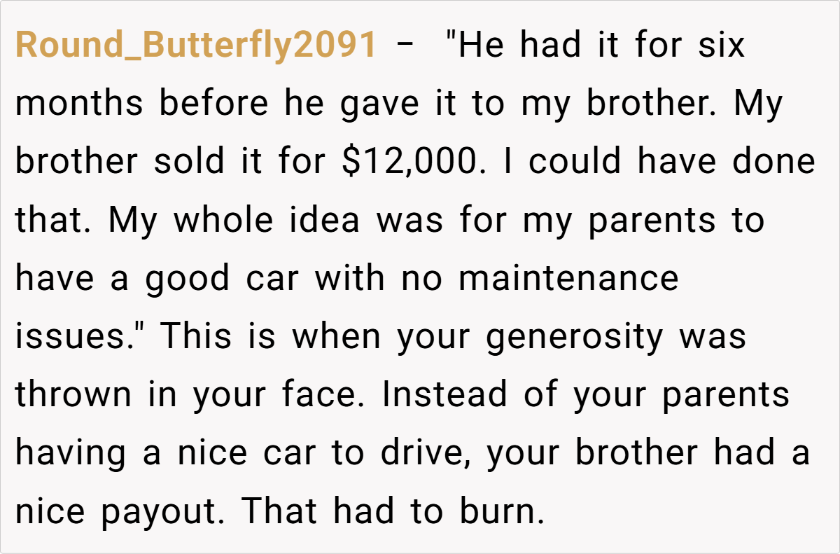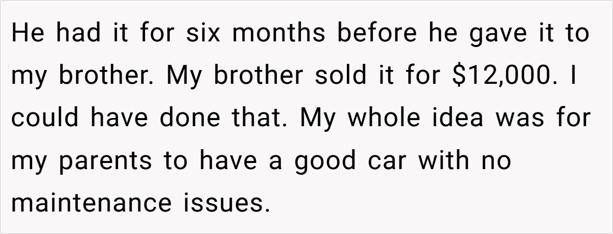 This story reminds us that even well-meant offers can ignite familial strife when underlying issues come into play. The OP’s attempt to secure a beneficial deal for their parents ended up exposing old wounds and sparking new conflicts. When family loyalty and financial decisions intersect, the outcomes are rarely straightforward. What would you do if faced with a similar situation? Share your thoughts and experiences—let’s keep the conversation rolling, just like a well-tuned engine.