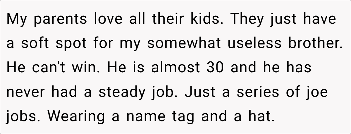 Family financial arrangements are fraught with emotion. As our storyteller illustrates, even a simple vehicle exchange can morph into a symbol of deeper grievances—here, the resentment over a “useless” sibling and perceived favoritism.