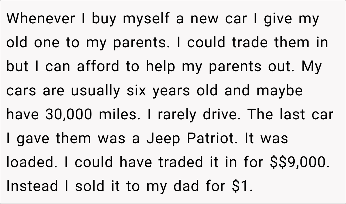 Family dynamics can get as twisty as a winding country road—especially when generosity collides with stubborn pride. In this tale of car exchanges and contracts, an OP tried to help out by offering their parents a deal on a vehicle upgrade. However, what started as a friendly offer soon turned into a battle of wills, revealing long-held resentments and unexpected twists in a family already grappling with favoritism and unresolved issues.
