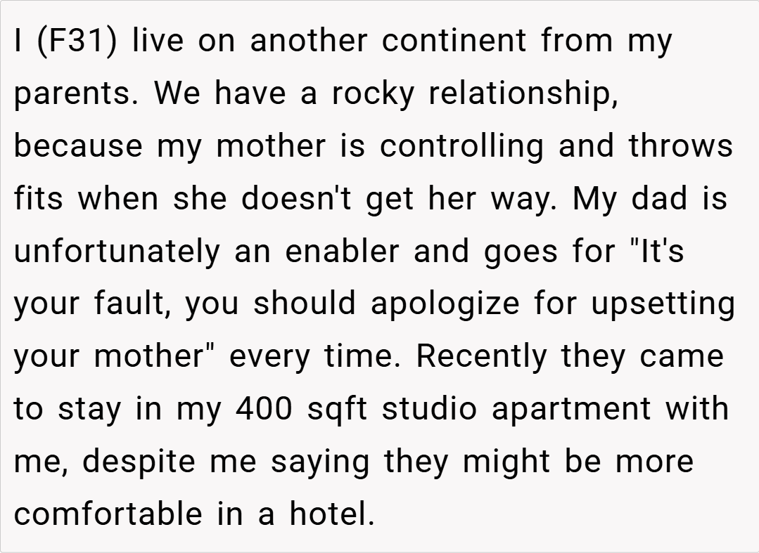 The OP, a 31-year-old living far from her parents, recounts a clash with her controlling mother during a recent visit. When a minor inconvenience triggered her mother’s silent treatment and overbearing behavior, the OP firmly questioned whether her parents should continue staying with her. This incident underscores the struggle between traditional, intrusive family dynamics and the need for personal boundaries and independence.