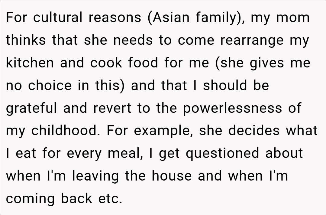Bringing family into your home can be a delicate dance of boundaries and expectations, especially when cultural traditions come into play. On one hand, OP’s mother likely sees her actions—rearranging the kitchen, planning every meal—as acts of love. However, to OP, these gestures feel more like an erasure of her independence, a regression into childhood where she has no say over her own life.
