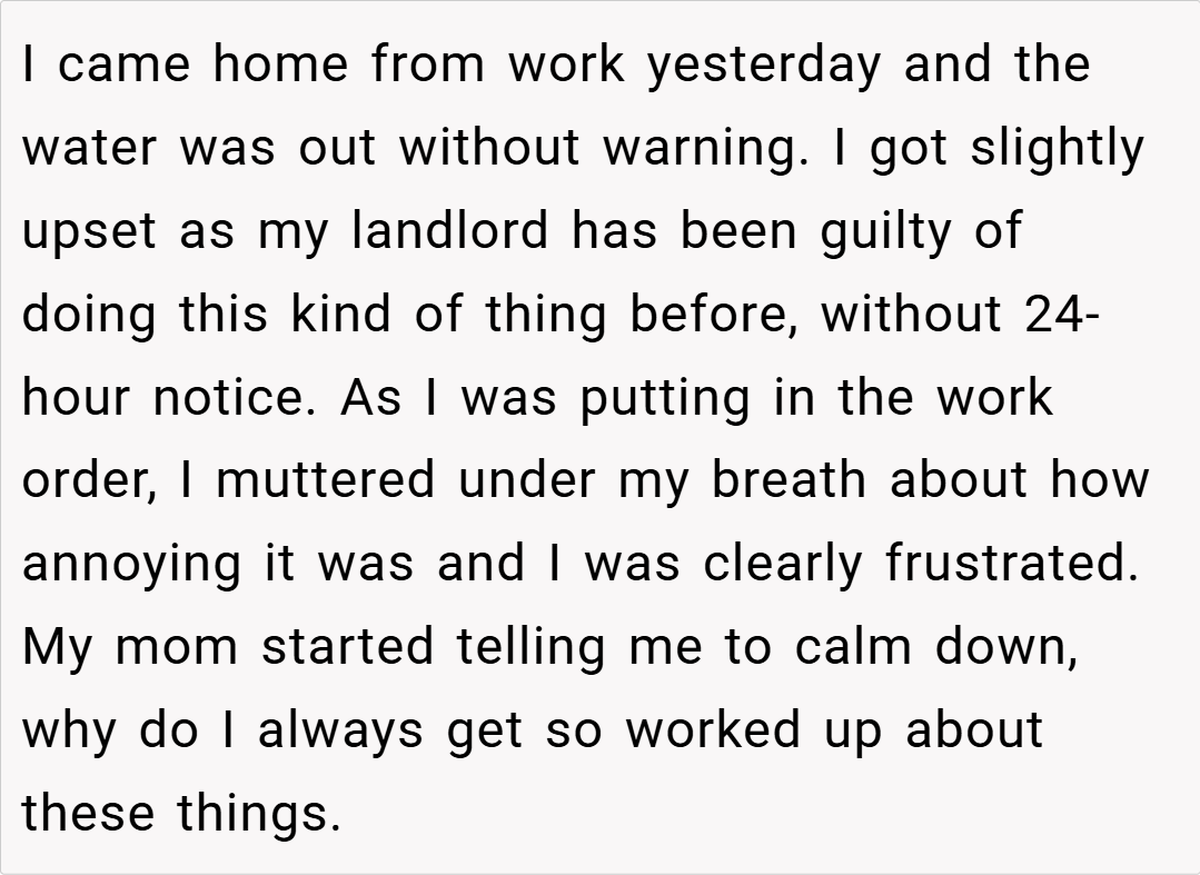 Ultimately, this story isn’t just about a single incident over a water outage—it’s about the broader struggle for independence and respect within the family unit. Our OP’s firm stance against her mother’s controlling behavior is a reminder that we all deserve to live in a space where our feelings are valued and our boundaries respected. While cultural expectations can sometimes make these situations more complex,
