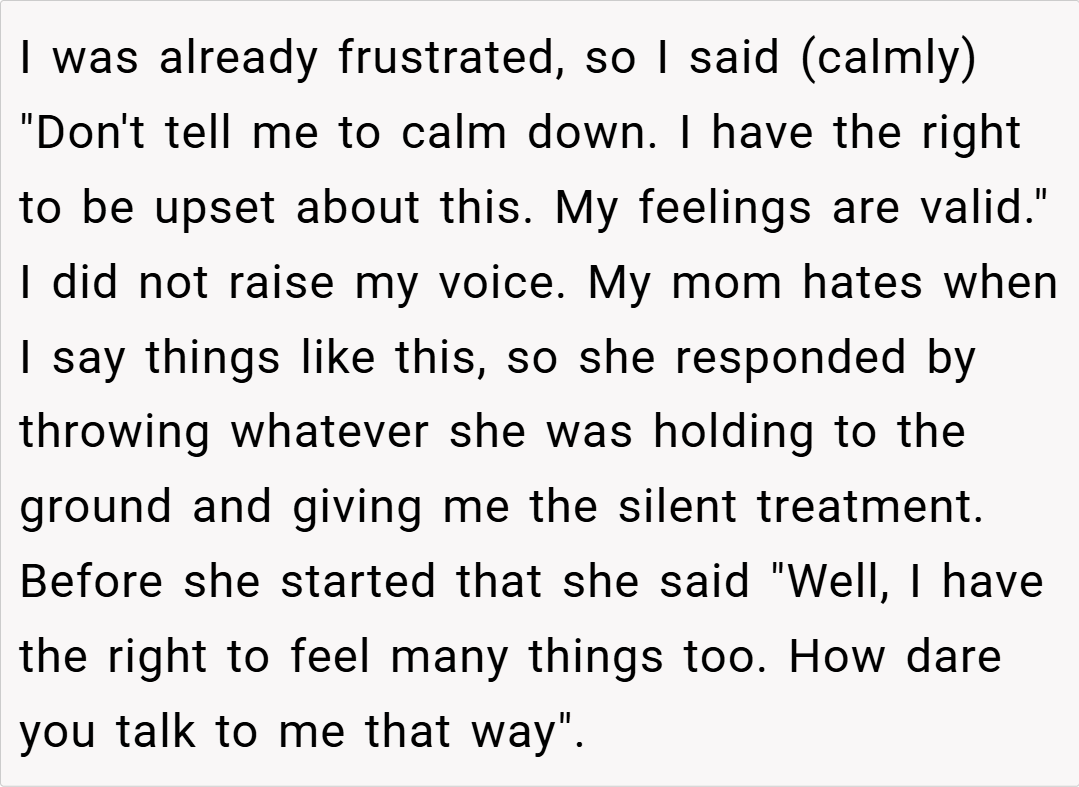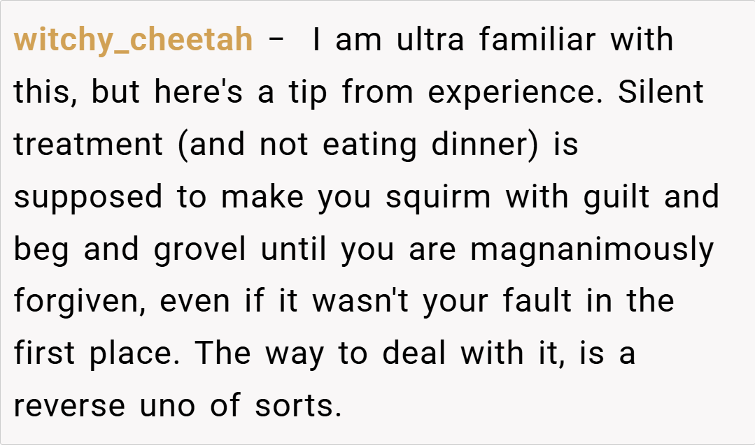According to a study published in Communication Research, silent treatment can cause psychological distress and erode relationships over time. When OP’s mother refused to speak or eat dinner, she wasn’t just expressing hurt—she was exercising control by forcing OP to either grovel for forgiveness or endure an unbearable household atmosphere.