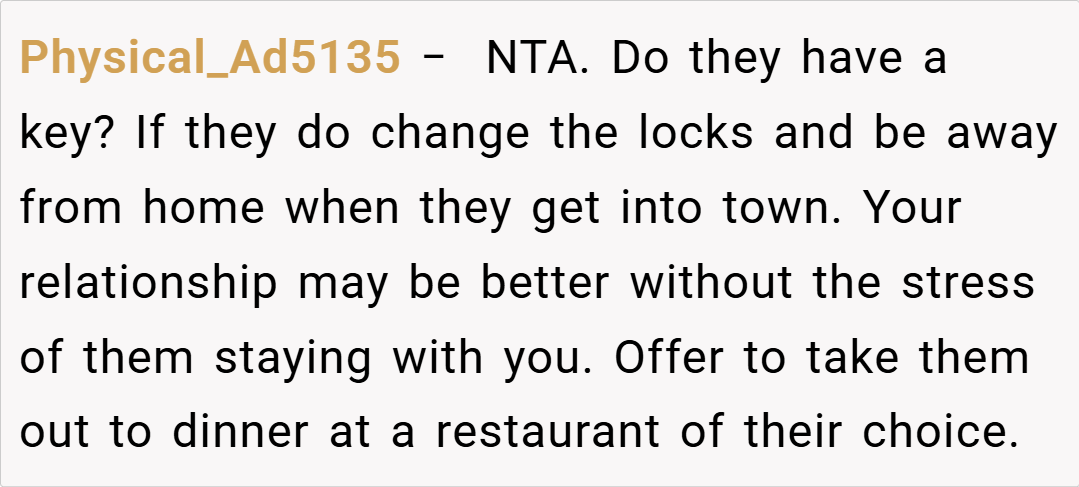 A range of voices in the Reddit community strongly back the OP’s decision. Many commenters point out that setting boundaries is essential, especially when dealing with controlling behavior that oversteps personal space. One recurring theme is that if her parents can’t respect her autonomy, then perhaps they shouldn’t impose themselves on her life.