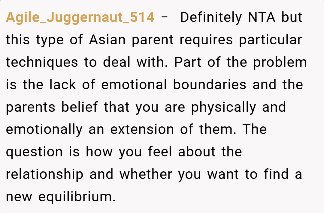 From a psychological standpoint, this is a textbook case of a controlling parent who struggles to acknowledge their adult child as a fully autonomous being. According to clinical psychologist Dr. Joshua Coleman, “Parents who are used to being in control often have difficulty respecting their children’s independence, especially in cultures that emphasize familial duty.”
